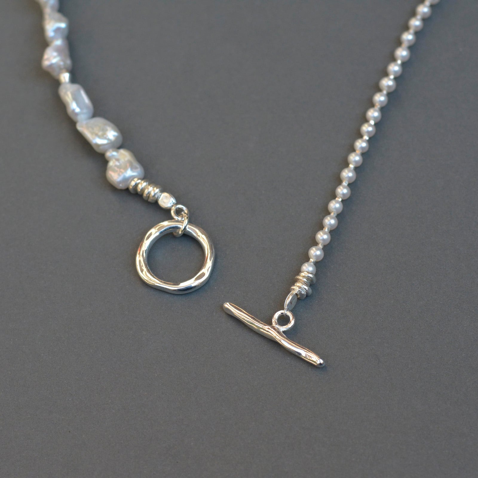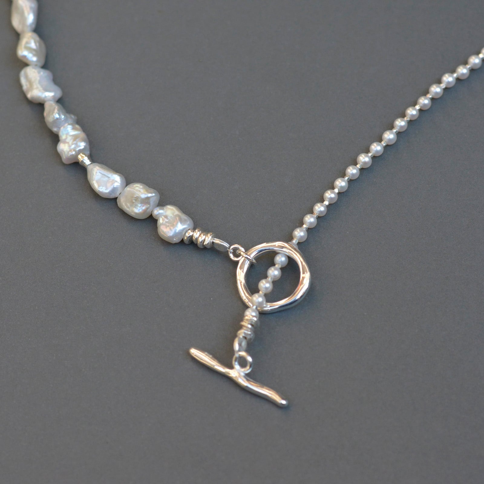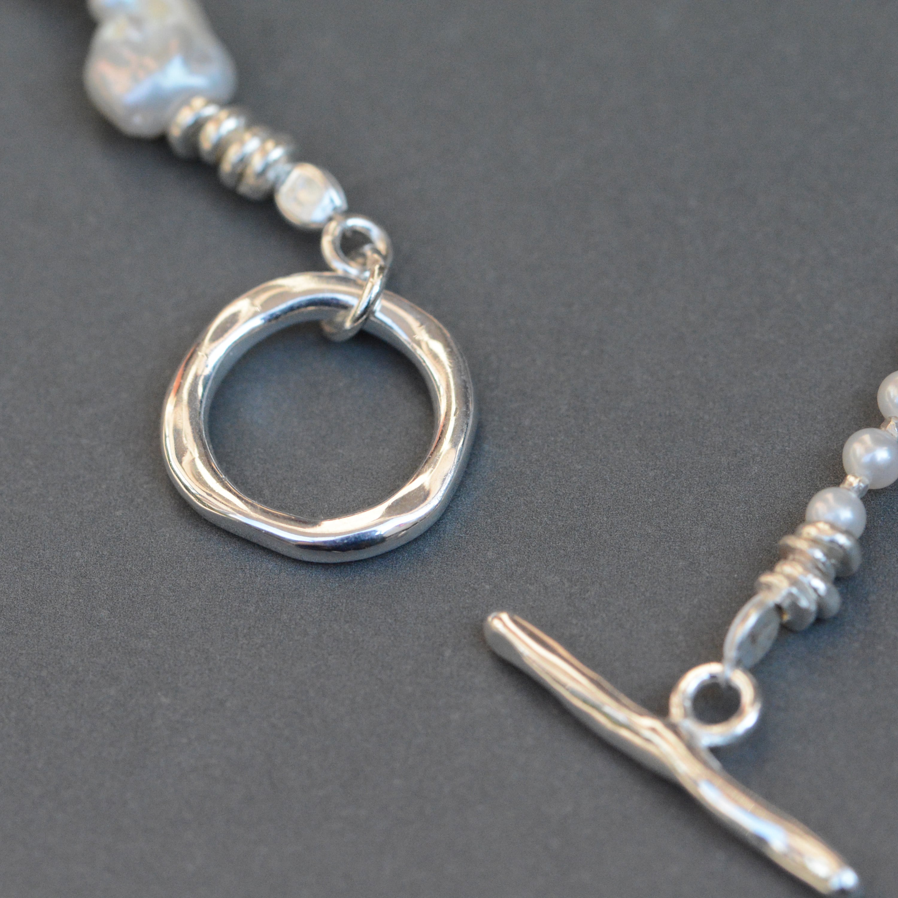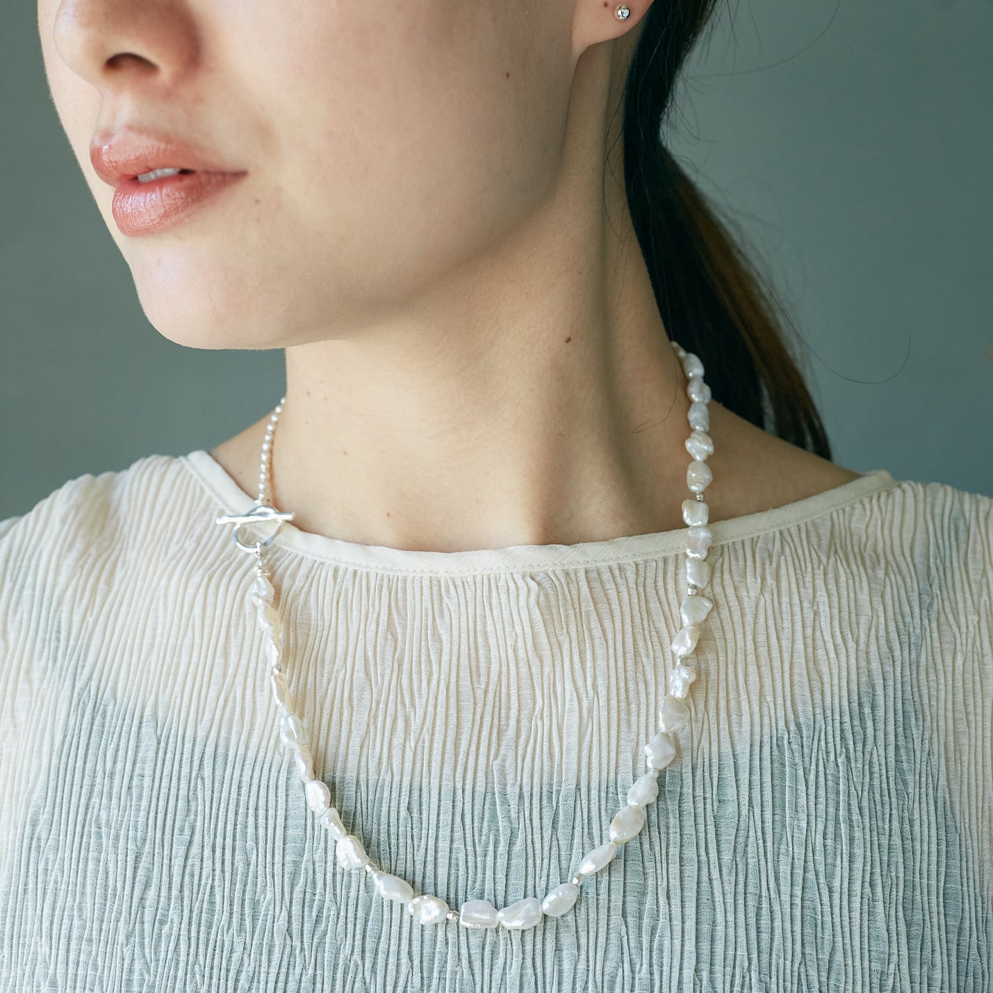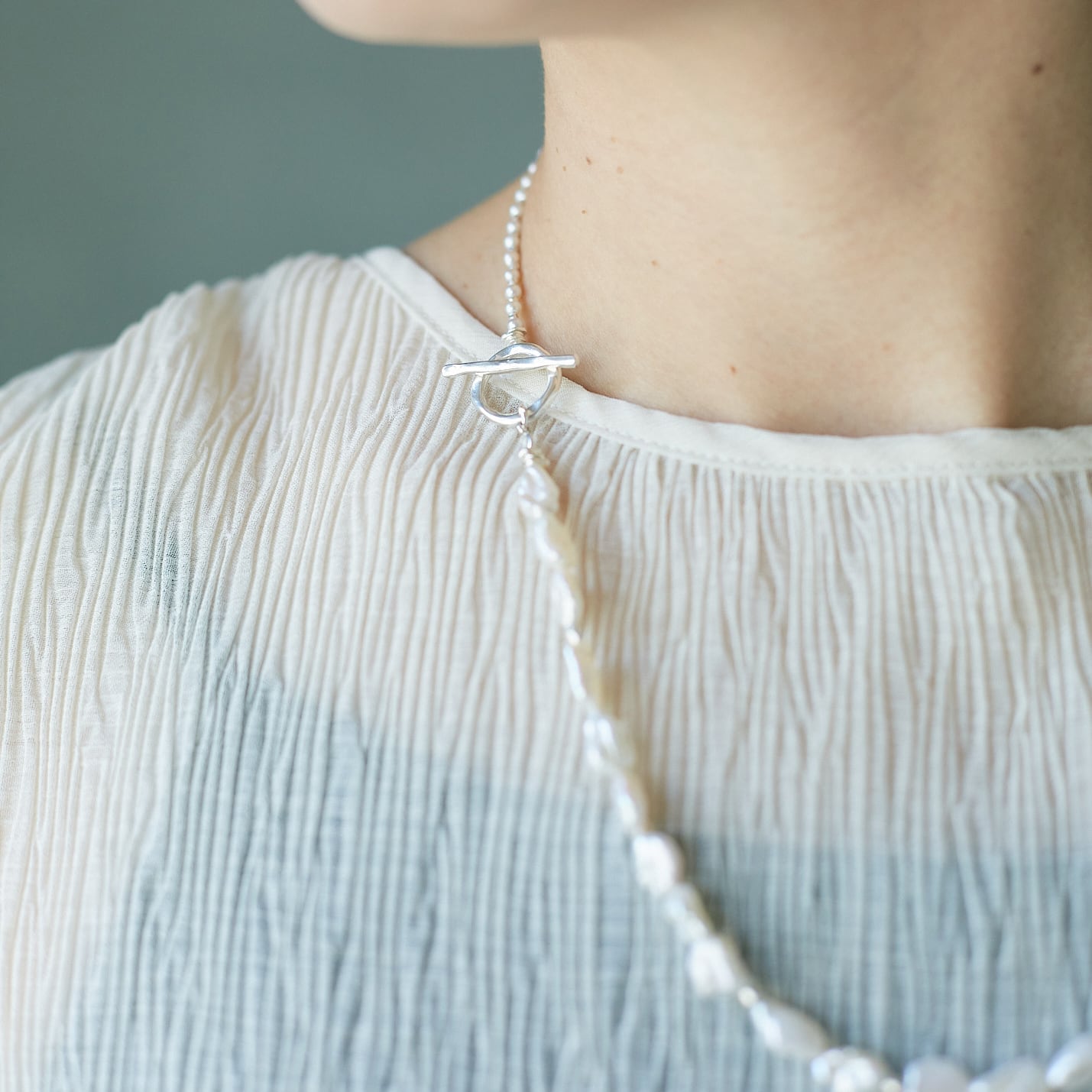 【2025AW Collection】 1cmほどの不揃いな淡水パールと小粒の淡水パールを贅沢に使用したネックレス。 留め具部分は自然なゆがみが美しいマンテルパーツを使用しております。 size:22mm x 22mm material:silver925,22K gold plt