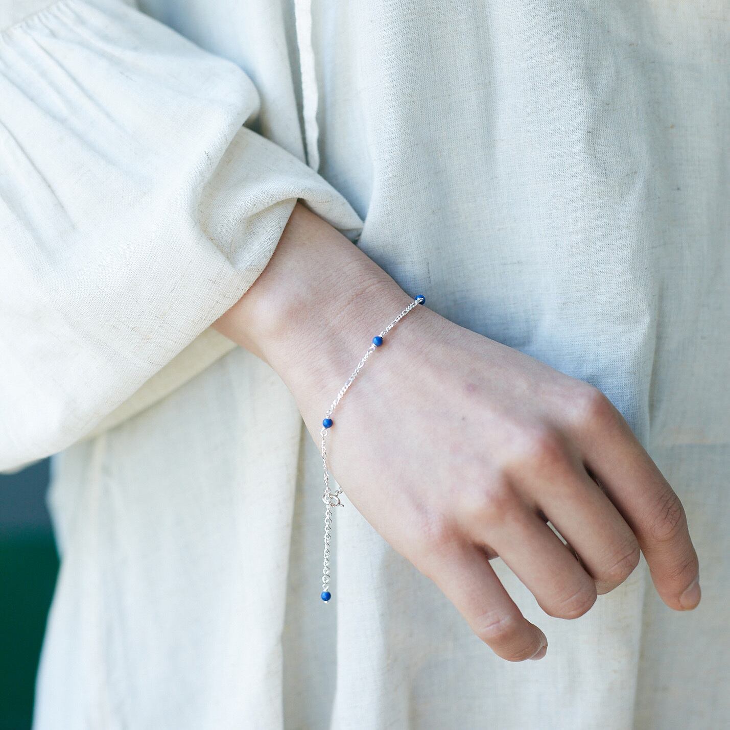 3mmほどのlapisと華奢なデザインのチェーンを組み合わせたブレスレット。