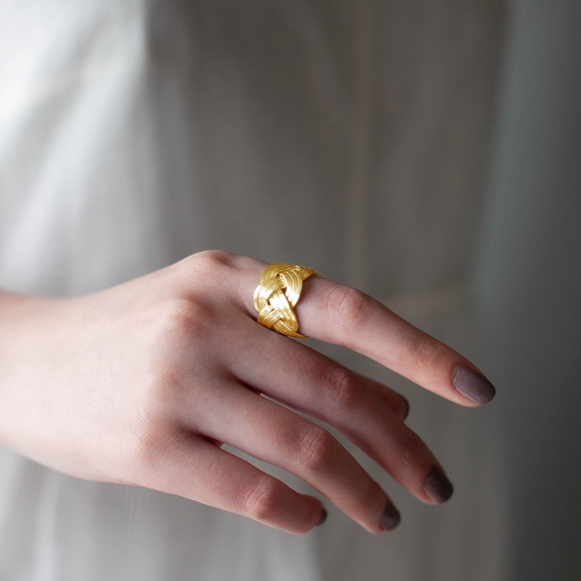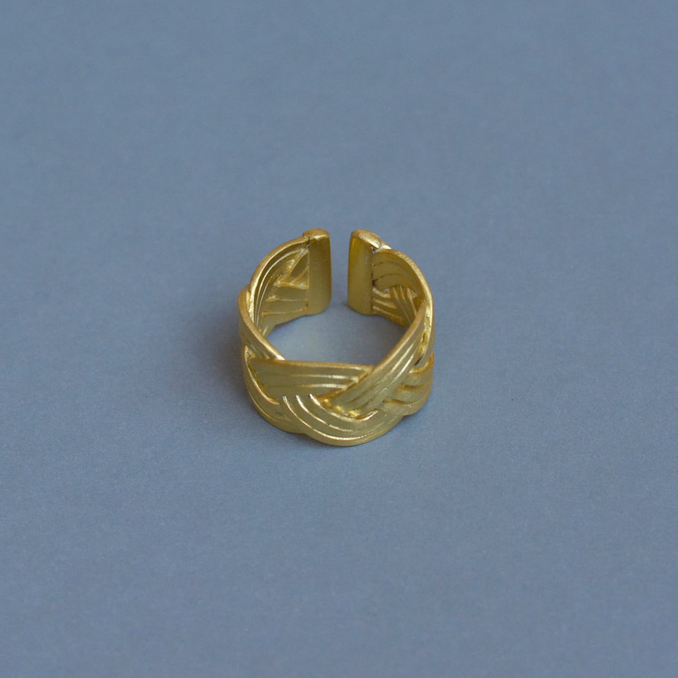 シルバーを三つ編み状にし,1点1点作ったリング。 存在感がありながらも繊細で 可憐で力強いアクセサリーです。 後ろが開いているので多少の調節が可能となっております。 【size1】約9~11号 【size2】約11~13号 material : silver , 22Kgold plt