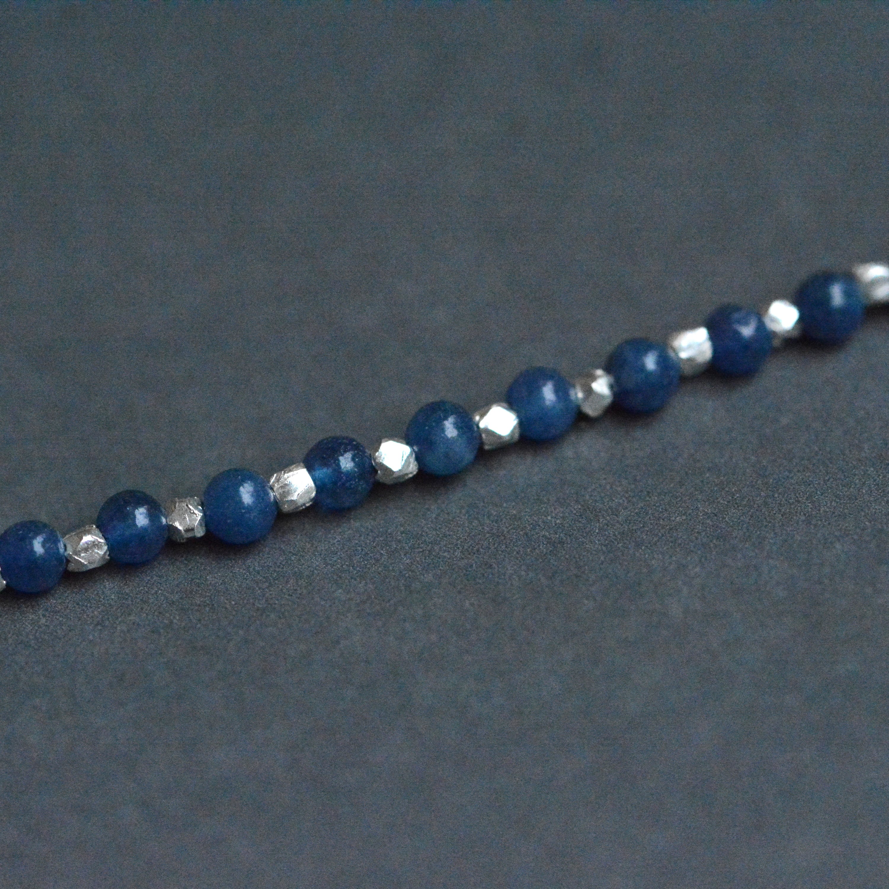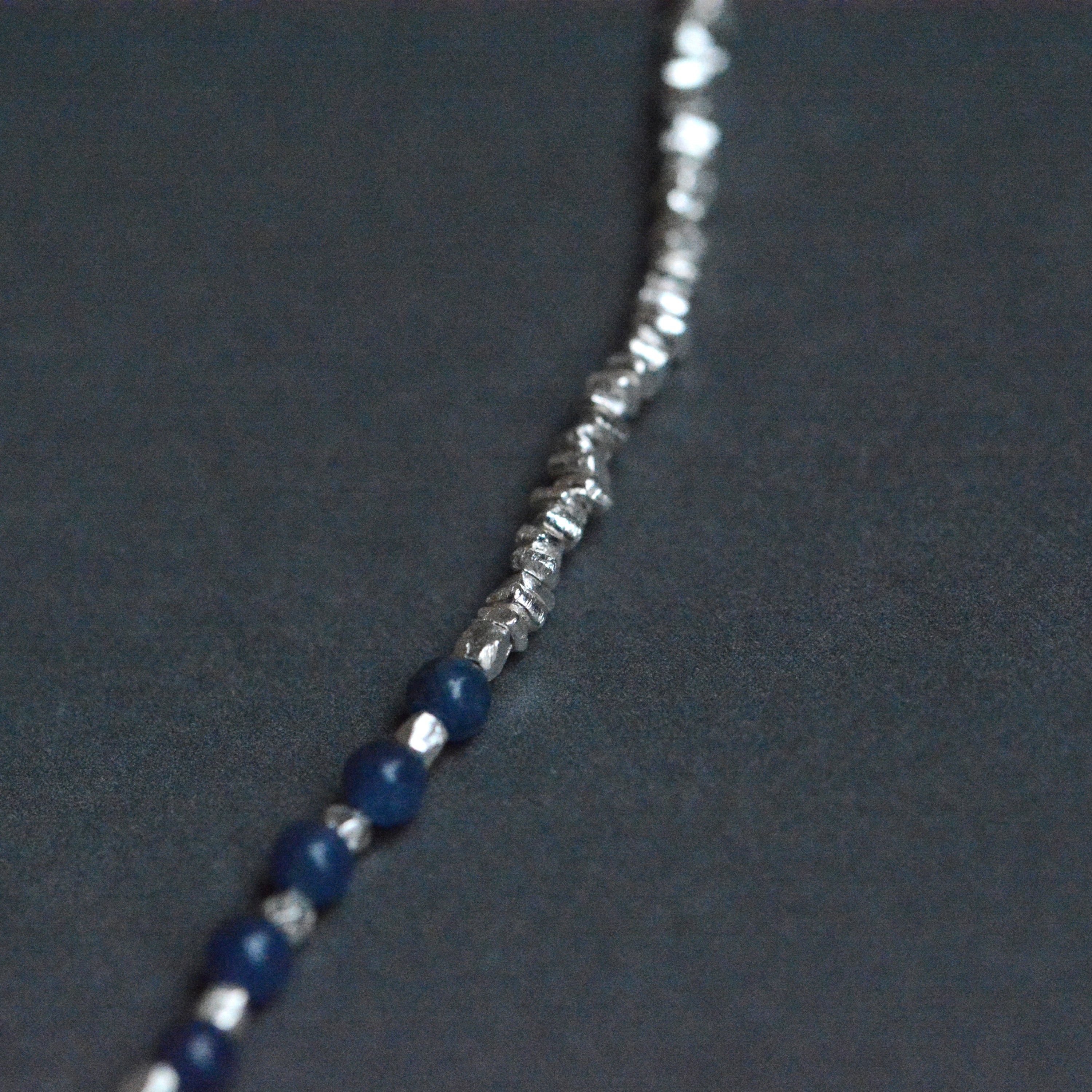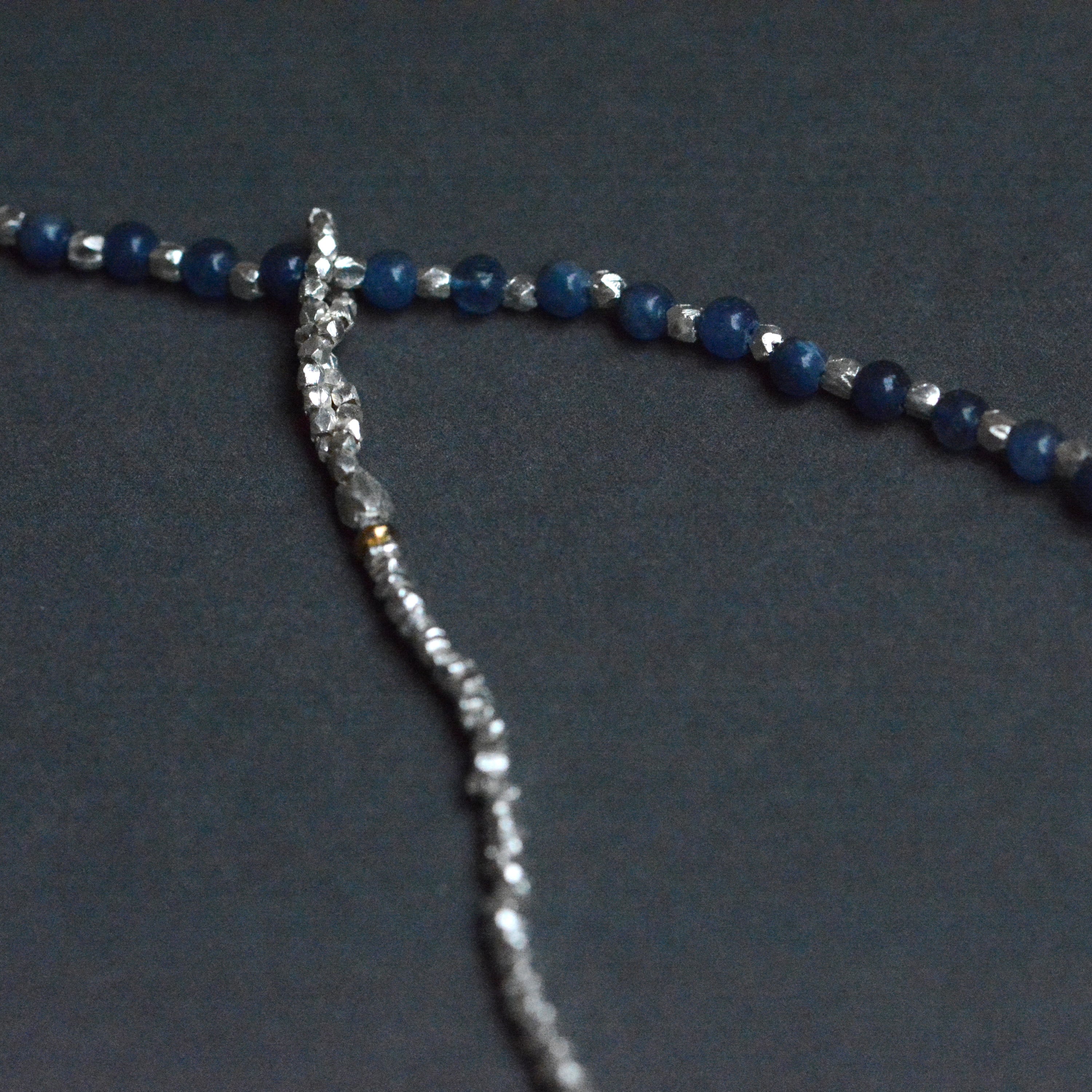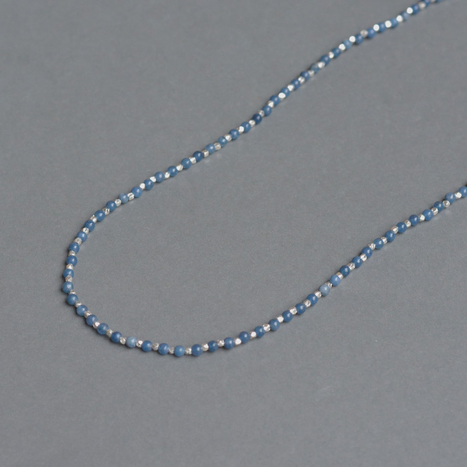 落ち着きのあるブルーのビーズが寄り添うネックレスで、