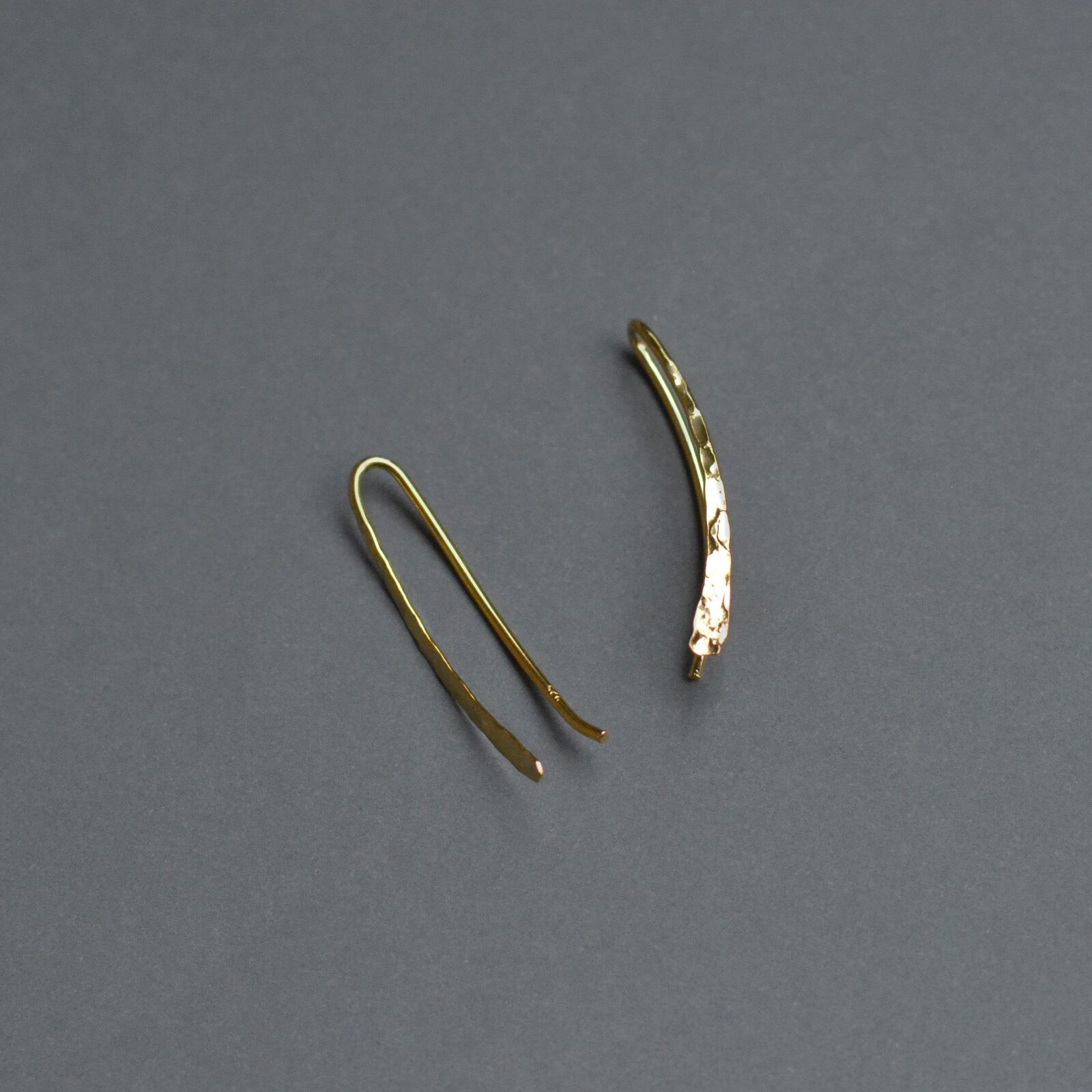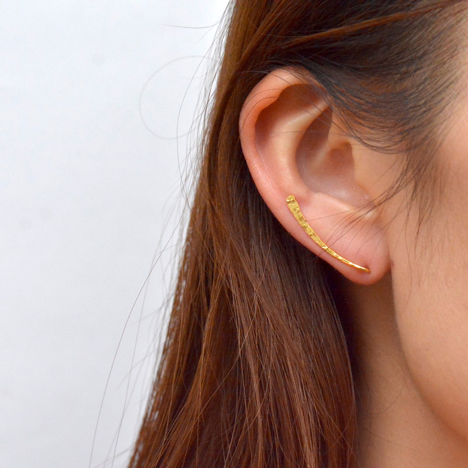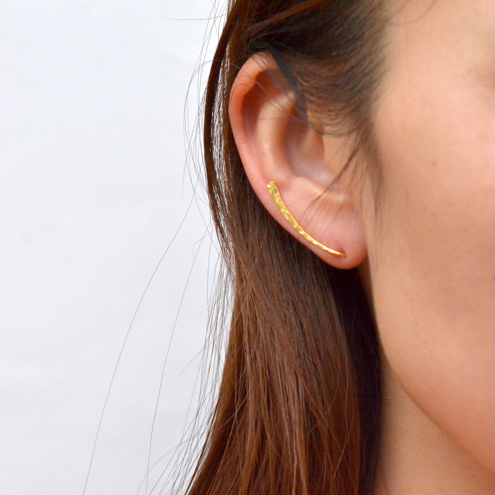 耳に沿うように着用するピアス。 槌目加工を施した表面がさりげなく輝きを放ちます。 軽やかな着用感とシンプルなデザインでさりげないオシャレにおすすめです。 size:約3cm material:silver,18K gold plt