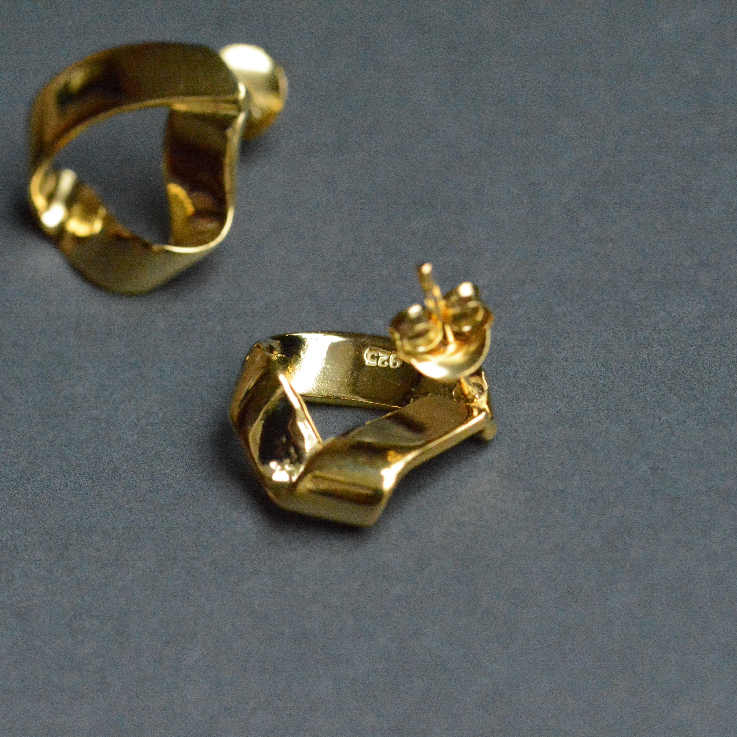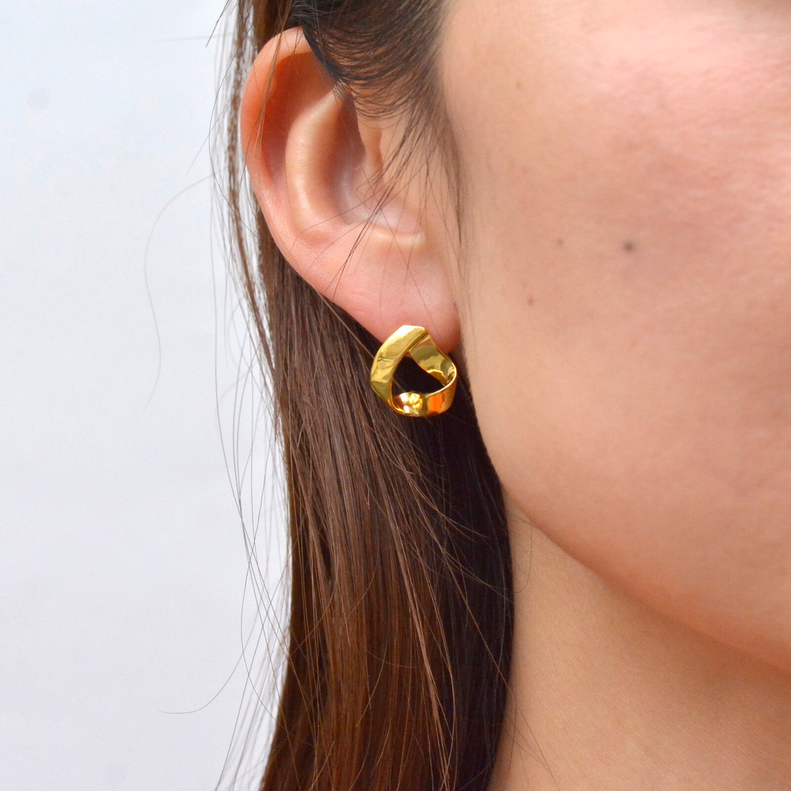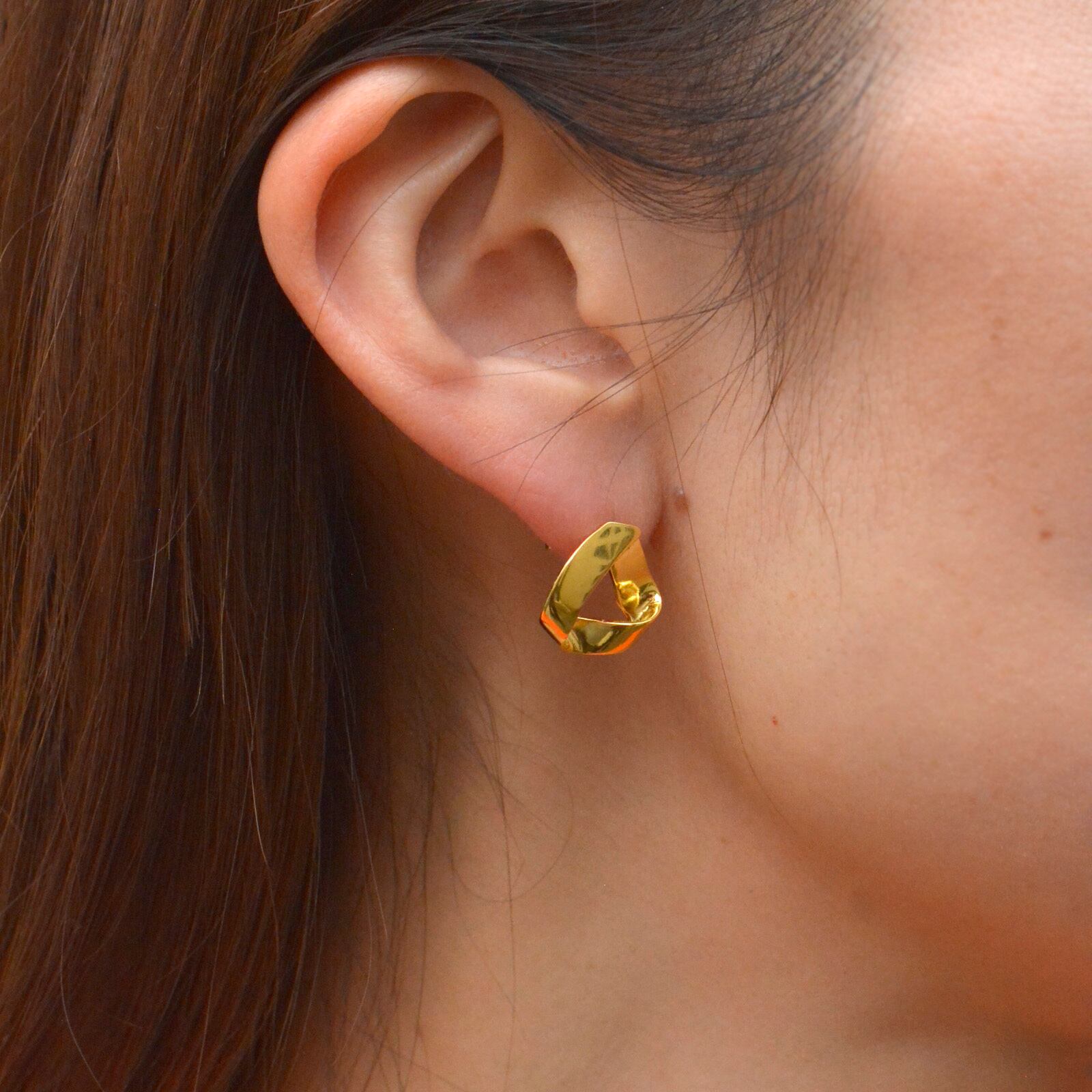リボンの柔らかなカーブをそのまま閉じこめたような、やさしいフォルムが魅力。 ひらひらとしたニュアンスがありつつも、控えめなデザインなので カジュアルにもきれいめにも合わせやすいピアスです。 size:約1.5cm material:silver,18K gold plt