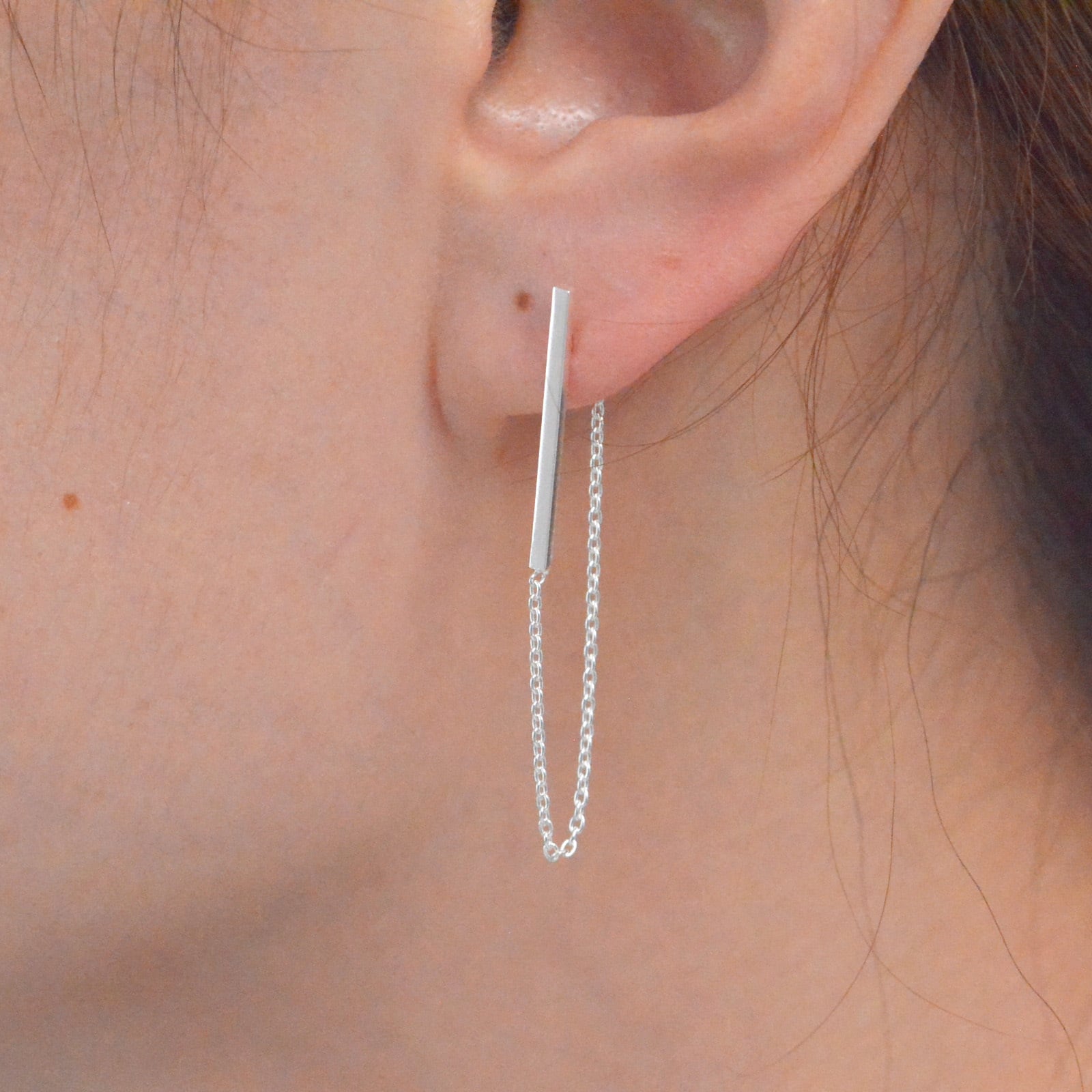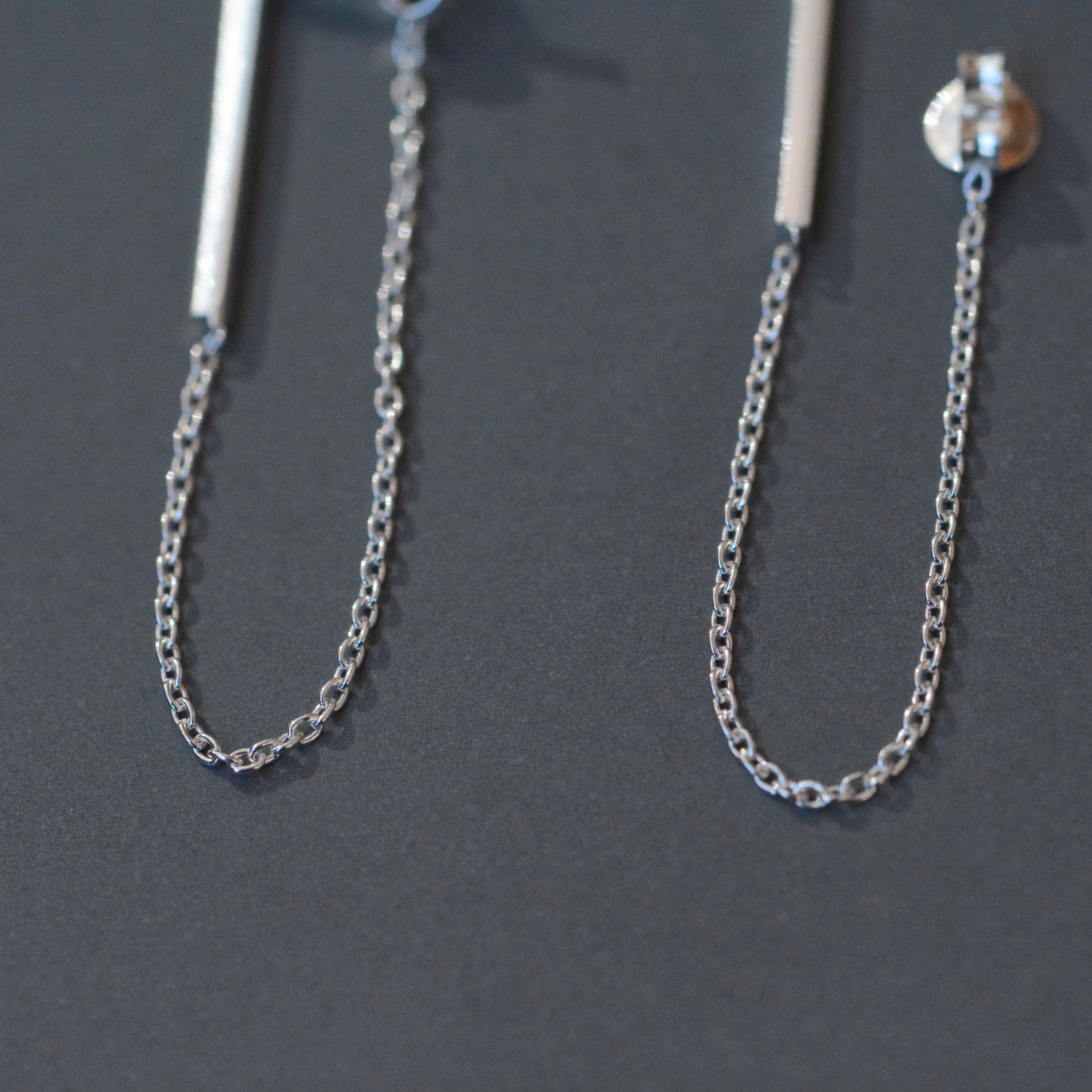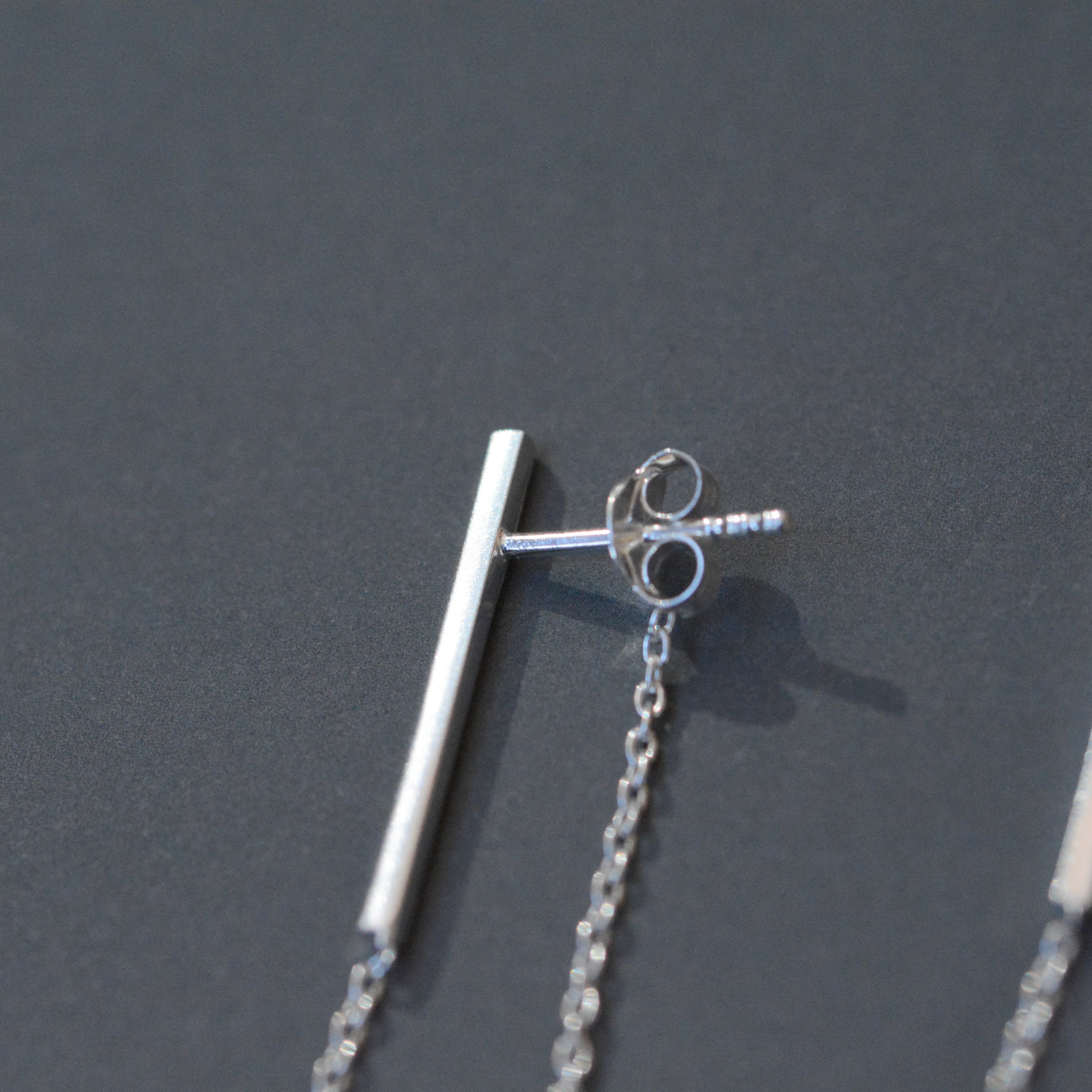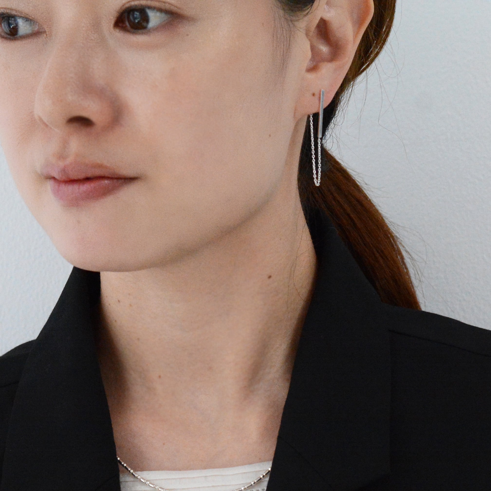 細く繊細なチェーンと、長めのバーモチーフをあしらったピアス。 チェーンの先端にピアスキャッチが付いたデザインなので、付け外しがしやすいです。 ミニマルなバーデザインと、控えめにゆれるチェーンの組み合わせが 遊び心と上品さを演出。 size:約85mm モチーフsize:20mm material:silver