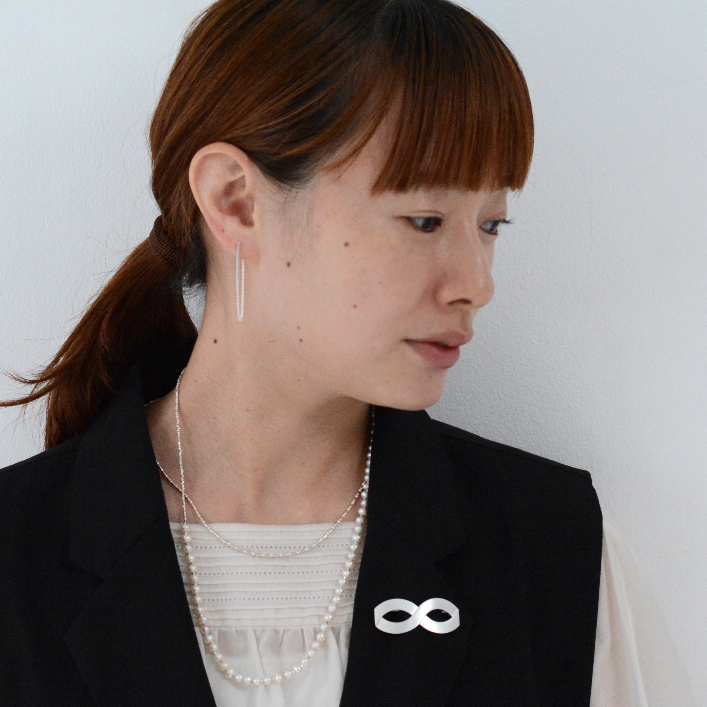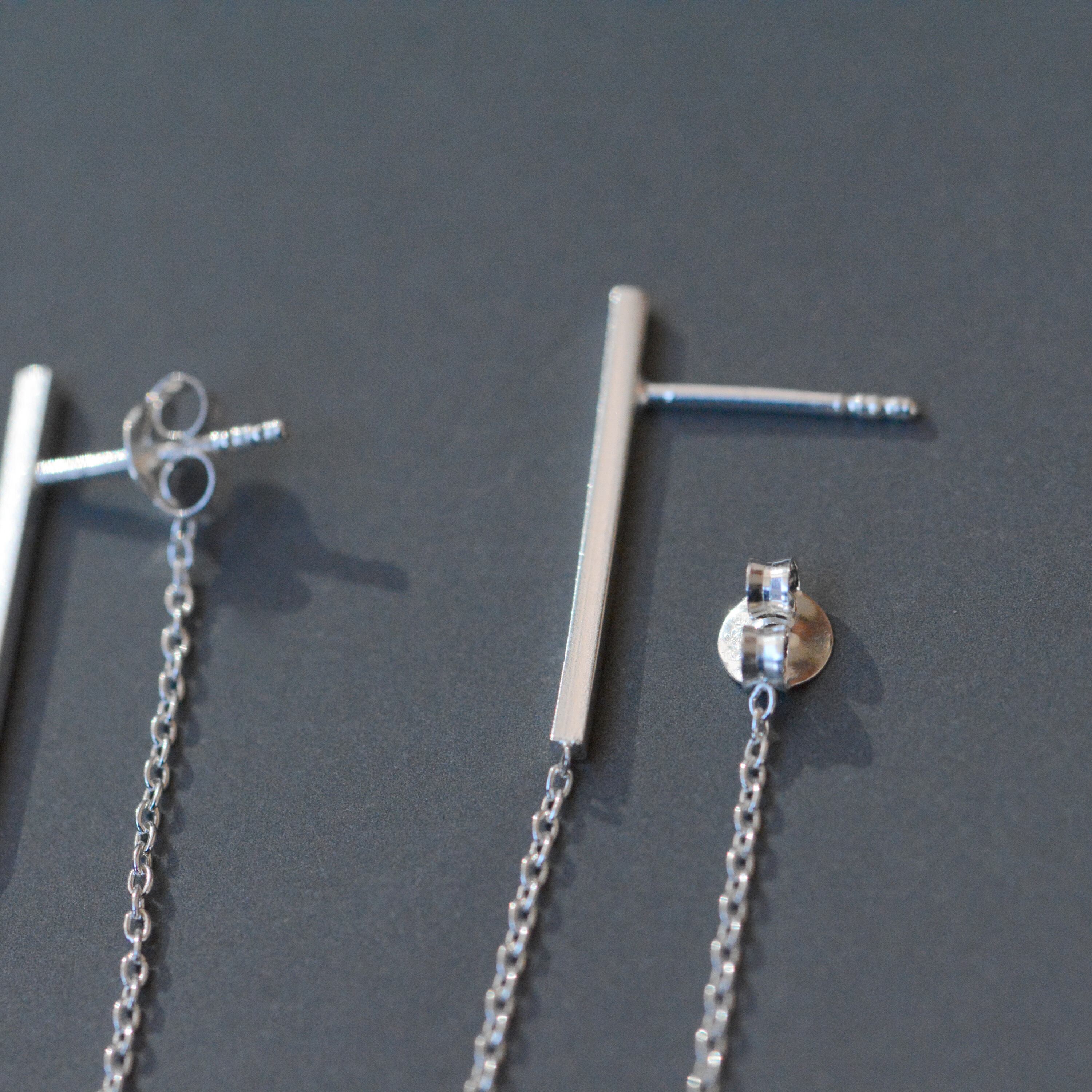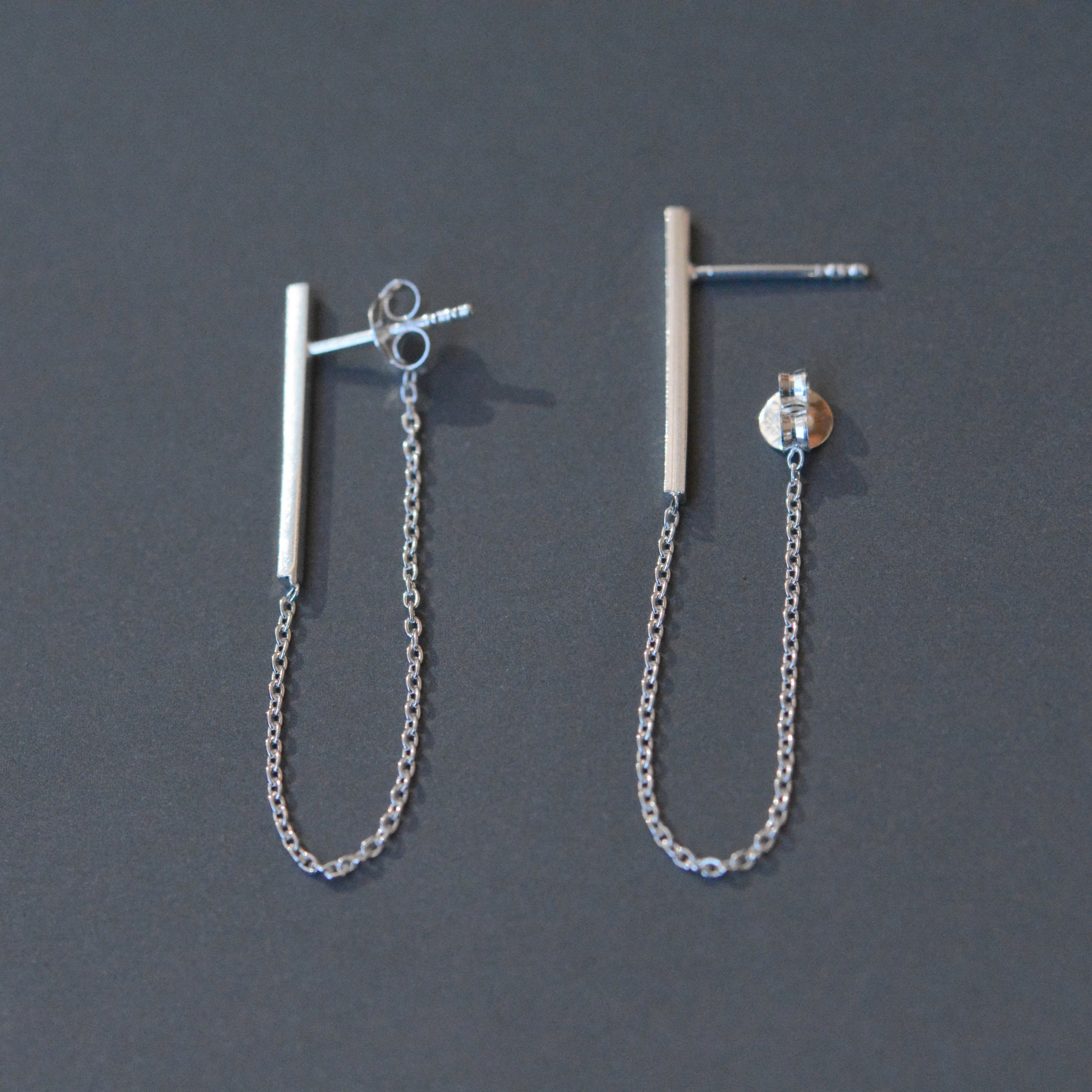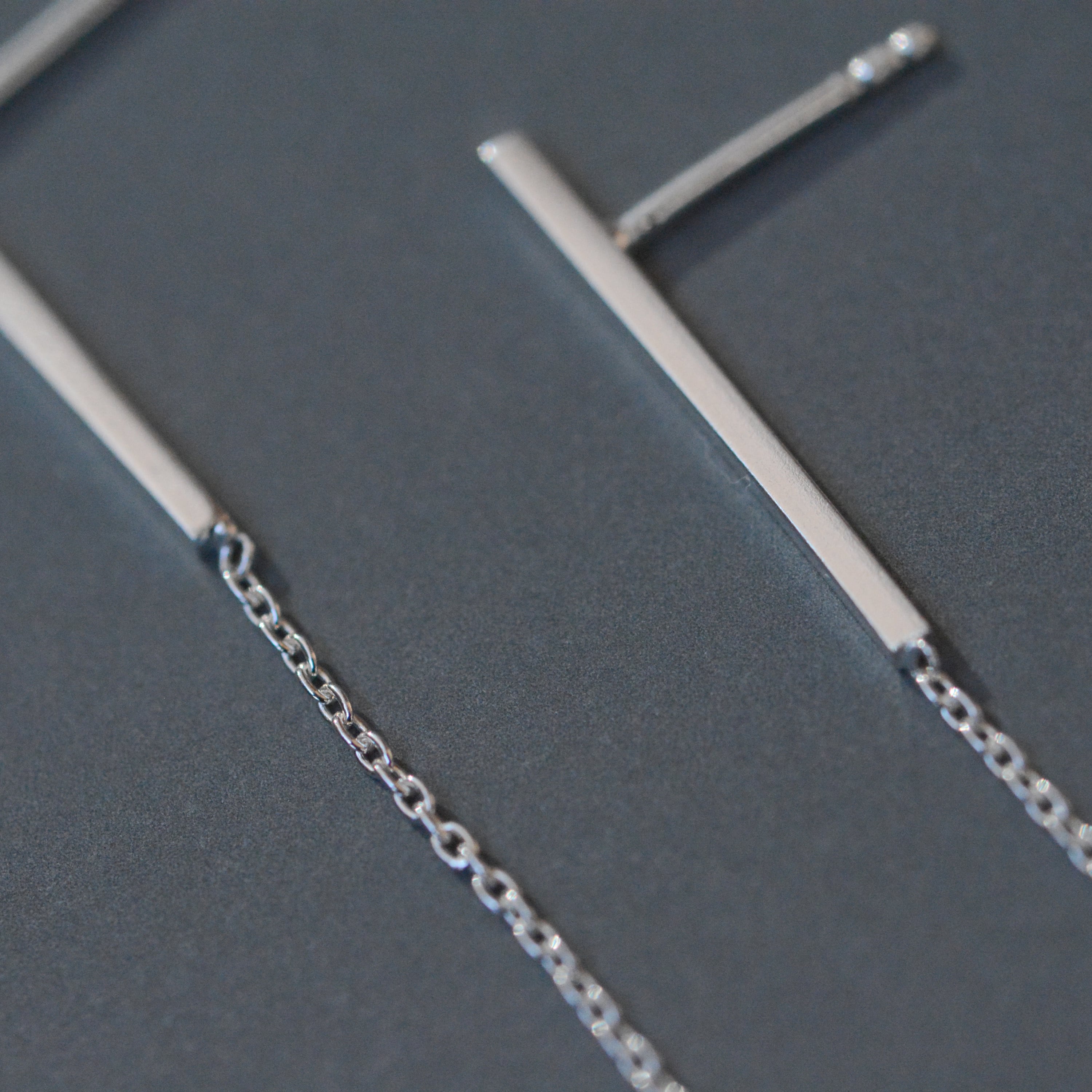 細く繊細なチェーンと、長めのバーモチーフをあしらったピアス。 チェーンの先端にピアスキャッチが付いたデザインなので、付け外しがしやすいです。 ミニマルなバーデザインと、控えめにゆれるチェーンの組み合わせが 遊び心と上品さを演出。 size:約85mm モチーフsize:20mm material:silver