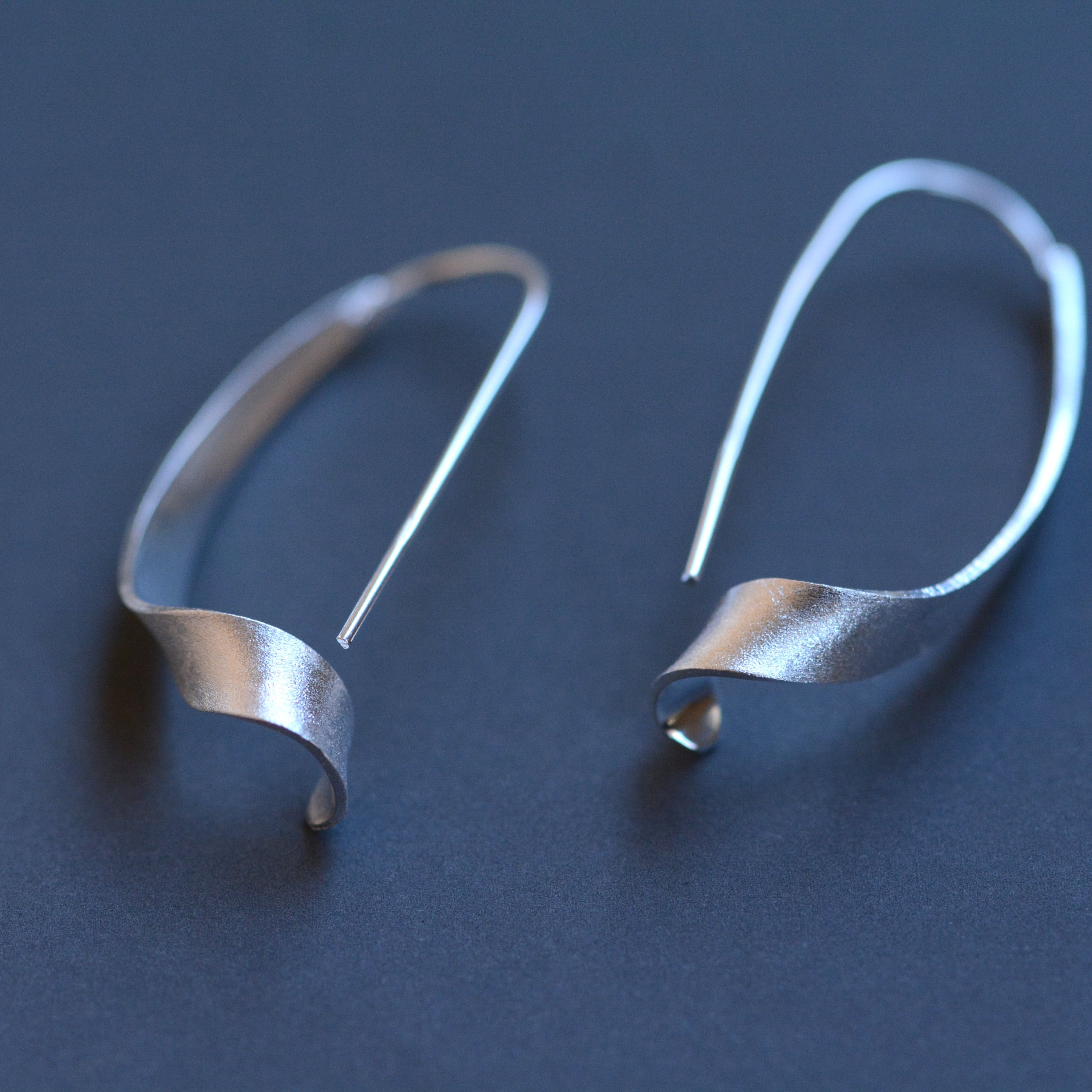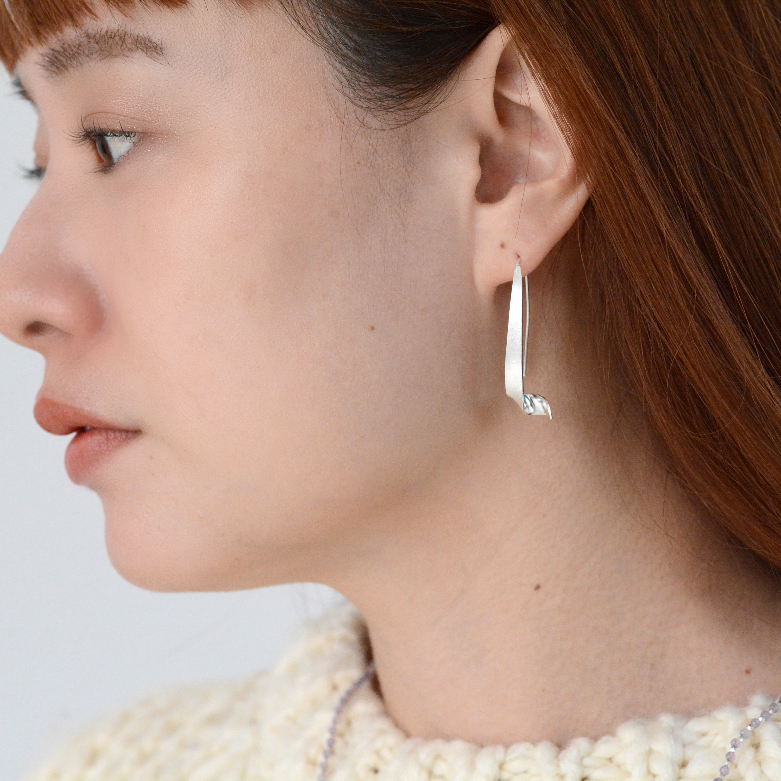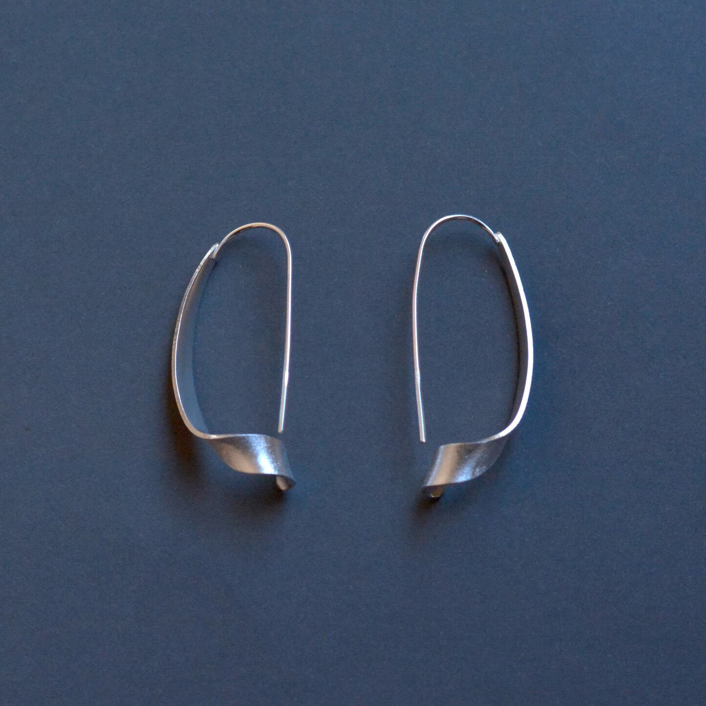 リボンのような軽やかで優雅な曲線を描いたピアス。 マットな質感の柔らかな光沢が、顔周りを上品かつモダンに彩ります。 フックタイプなので着脱しやすく深めフックで落ちにくい。 日常にさりげない華やぎを添える、洗練された大人のためのジュエリーです。 モチーフ全長:約4cm material:silver