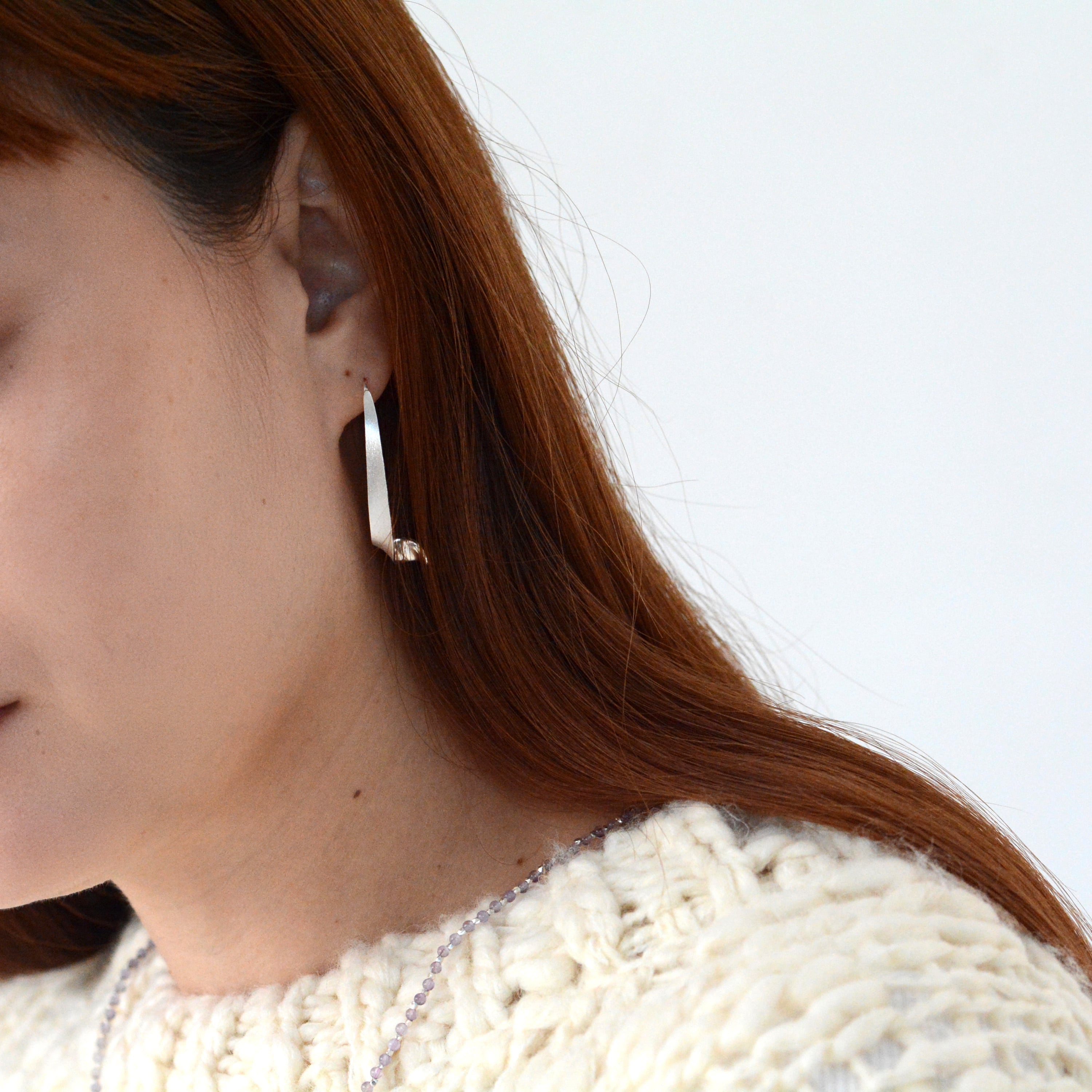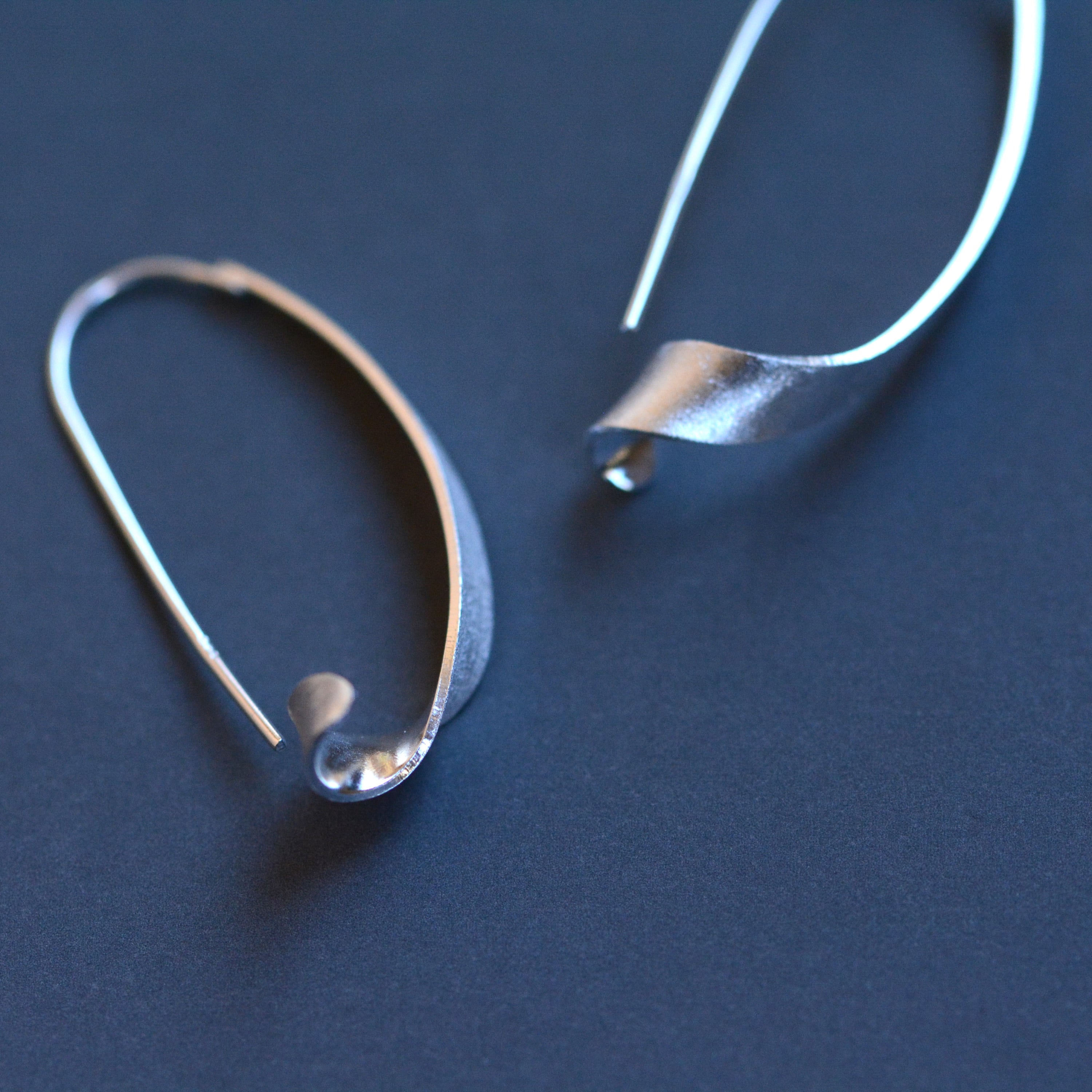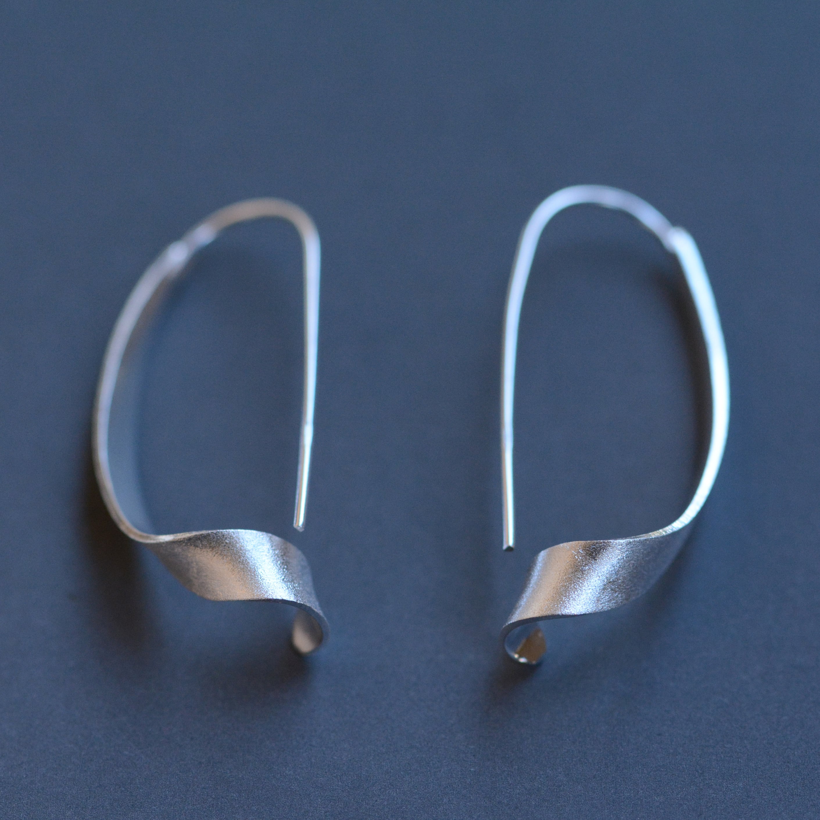 リボンのような軽やかで優雅な曲線を描いたピアス。 マットな質感の柔らかな光沢が、顔周りを上品かつモダンに彩ります。 フックタイプなので着脱しやすく深めフックで落ちにくい。 日常にさりげない華やぎを添える、洗練された大人のためのジュエリーです。 モチーフ全長:約4cm material:silver