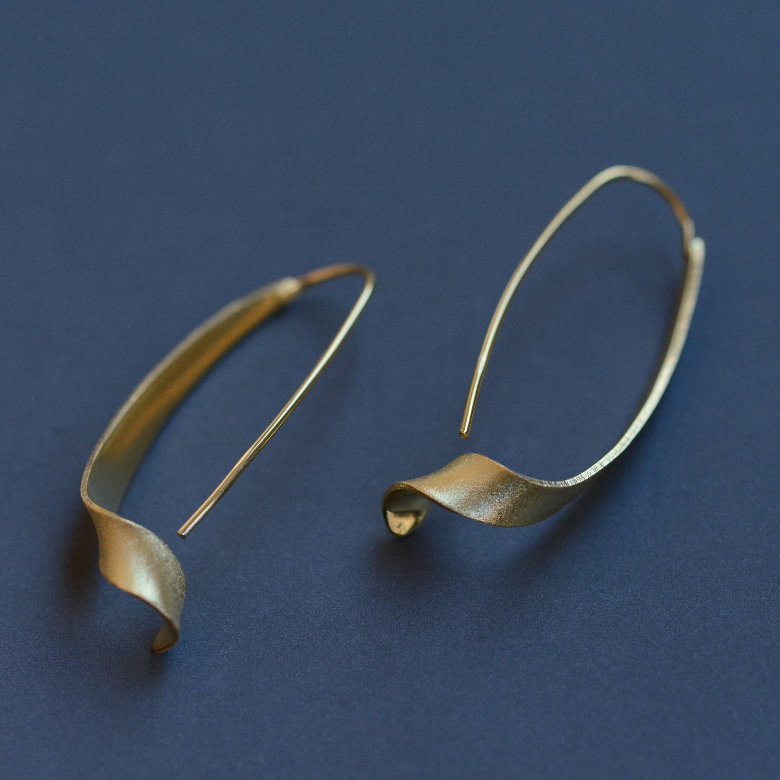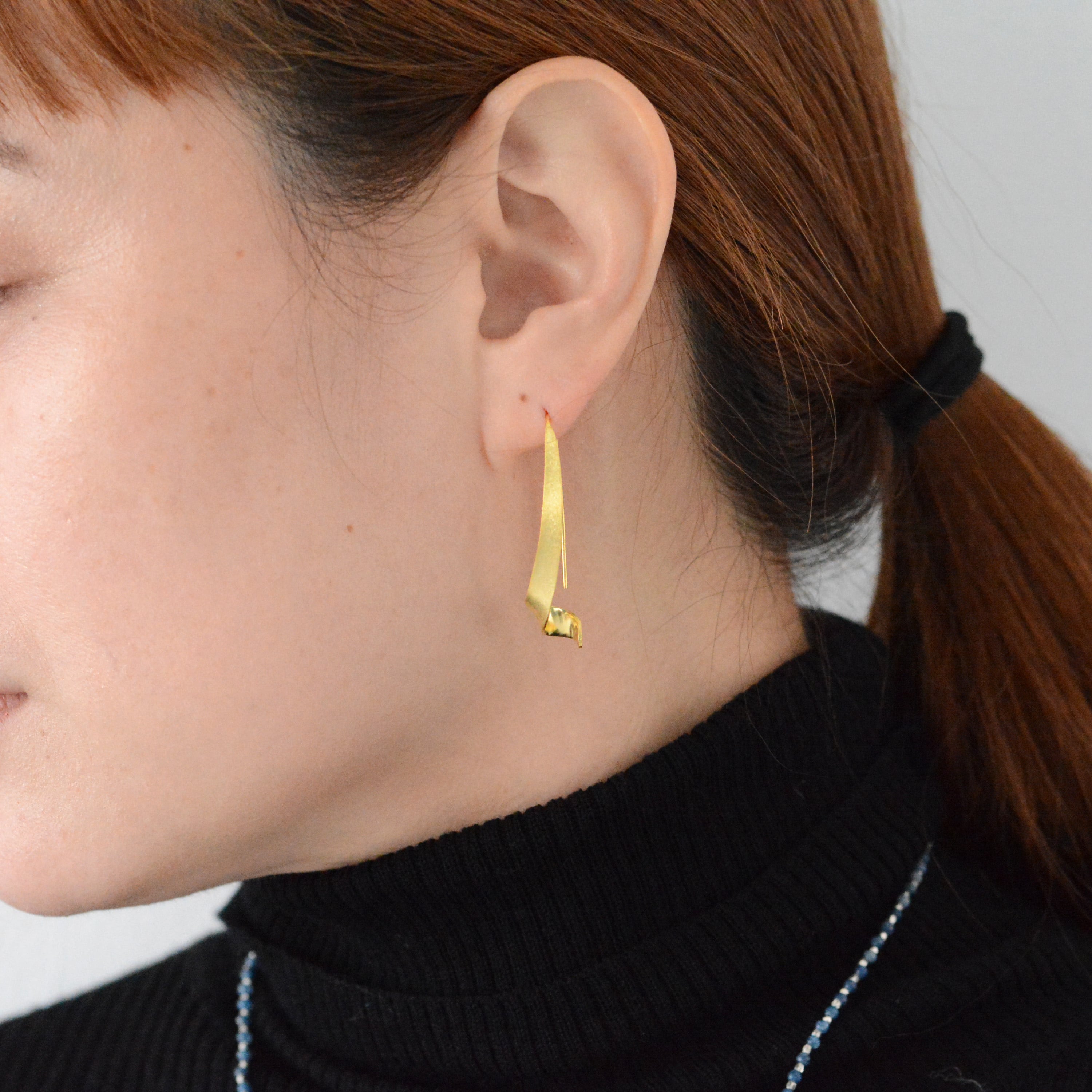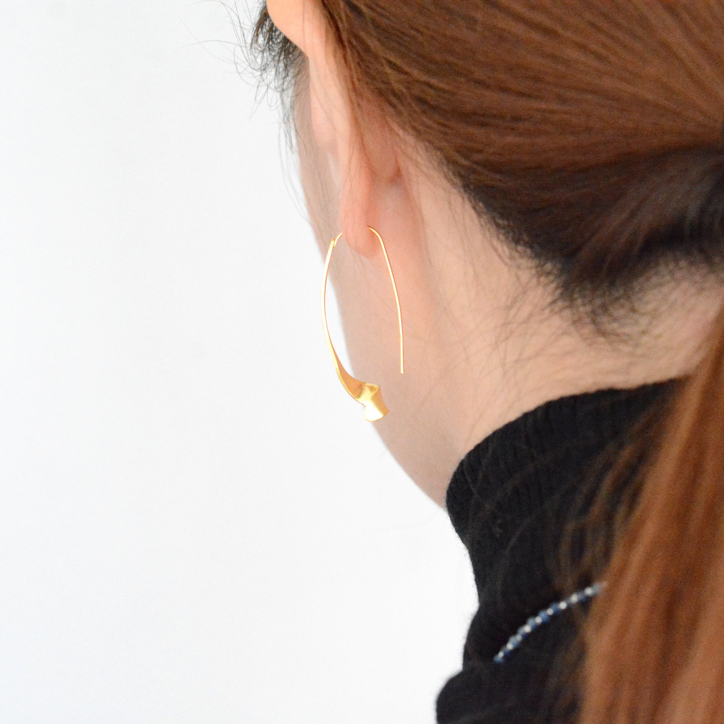 リボンのような軽やかで優雅な曲線を描いたピアス。 マットな質感の柔らかな光沢が、顔周りを上品かつモダンに彩ります。 フックタイプなので着脱しやすく深めフックで落ちにくい。 日常にさりげない華やぎを添える、洗練された大人のためのジュエリーです。 モチーフ全長:約4cm material:silver/gold plt