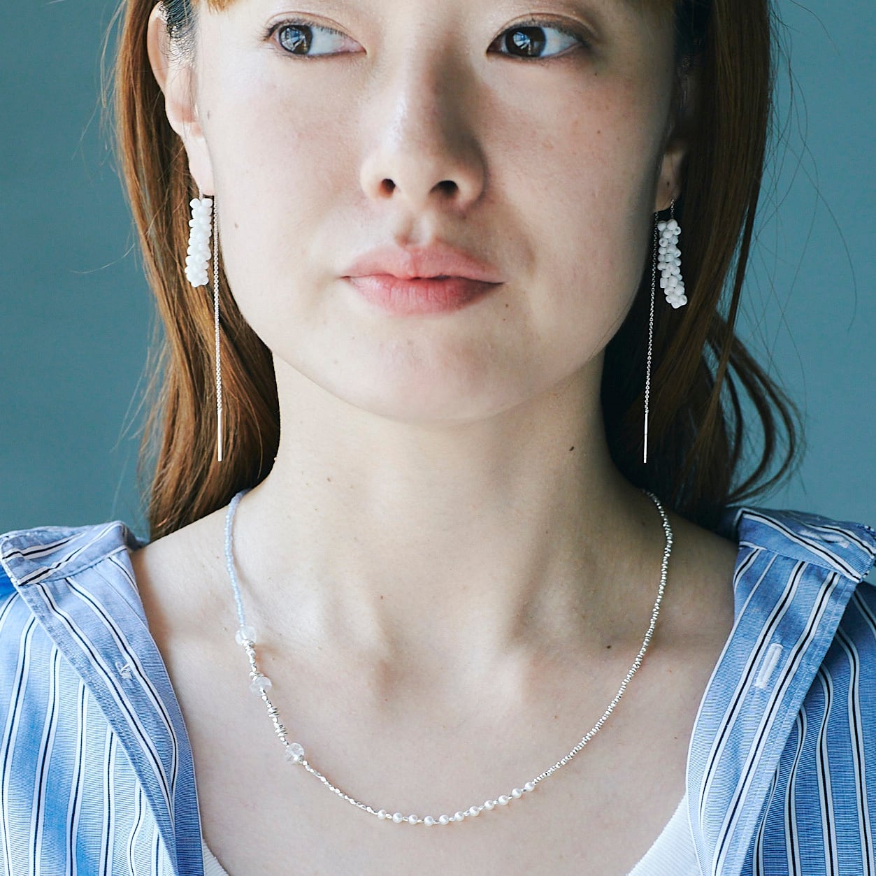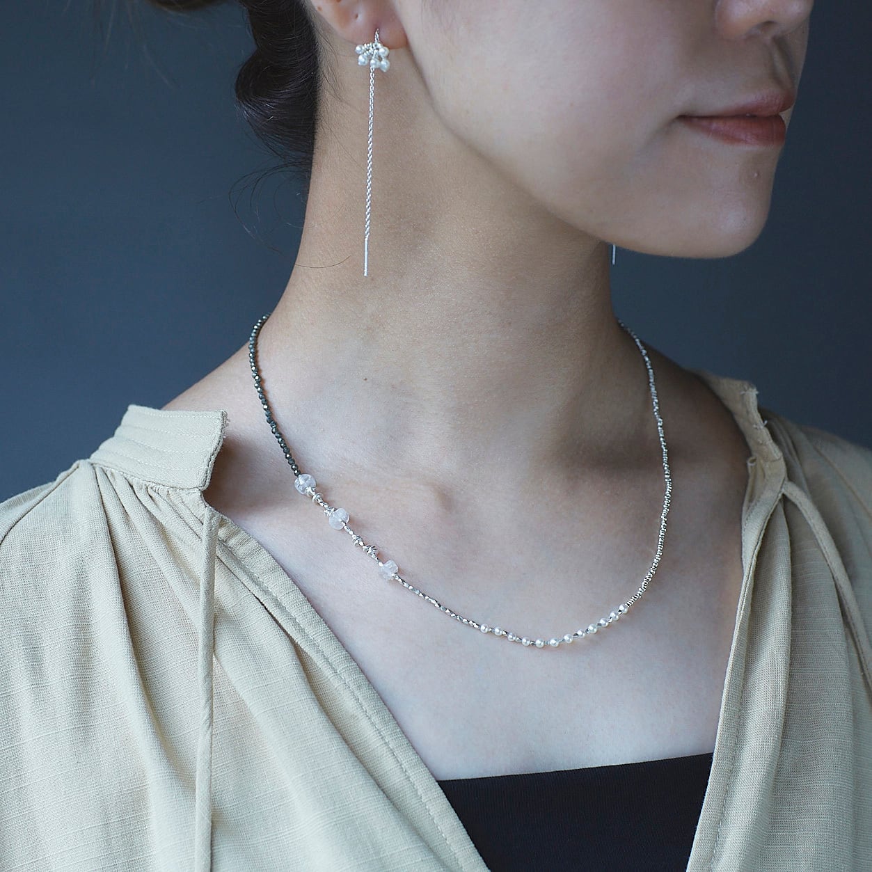 カットが入ったビーズの輝きとパールの上品さが、軽やかに首元を彩ります。