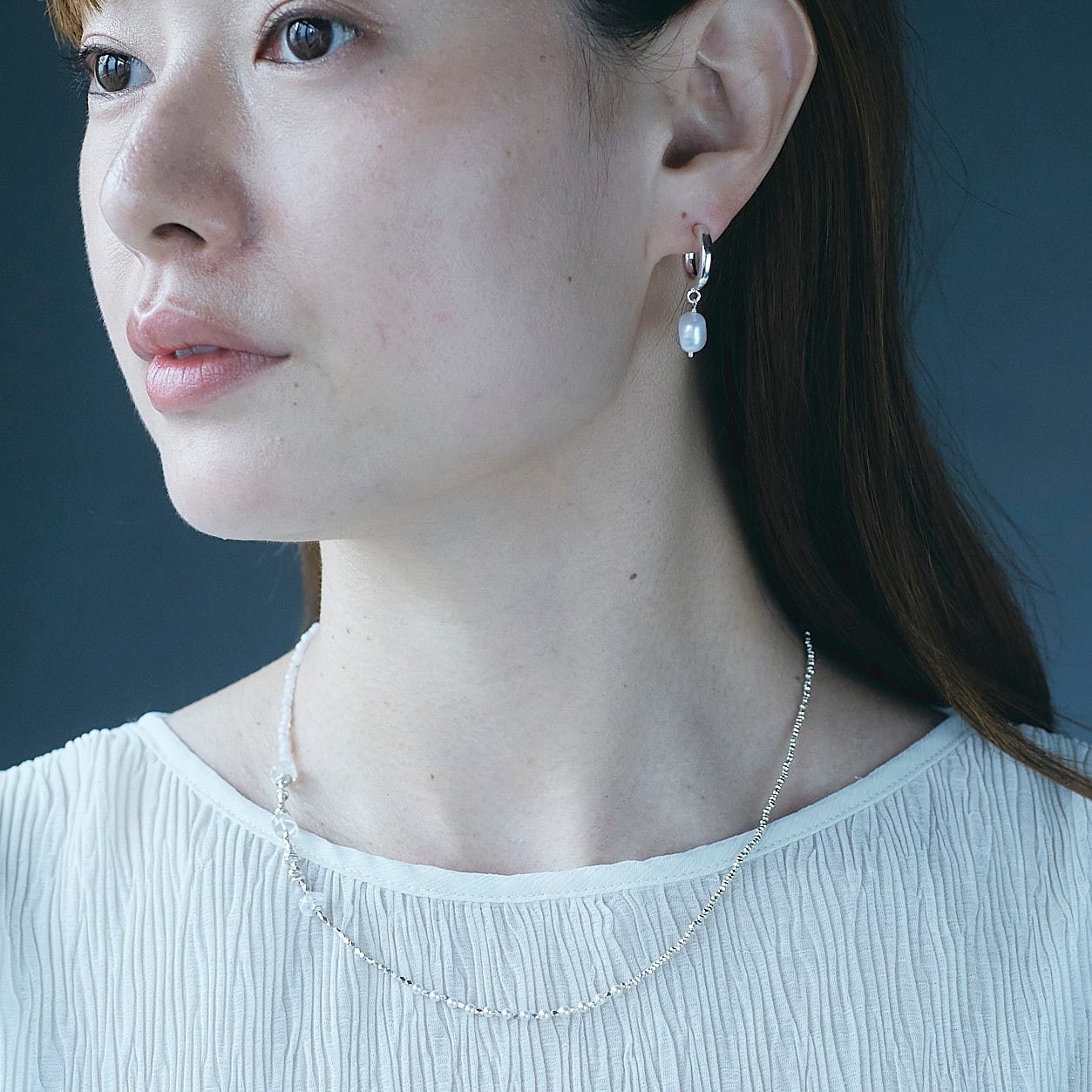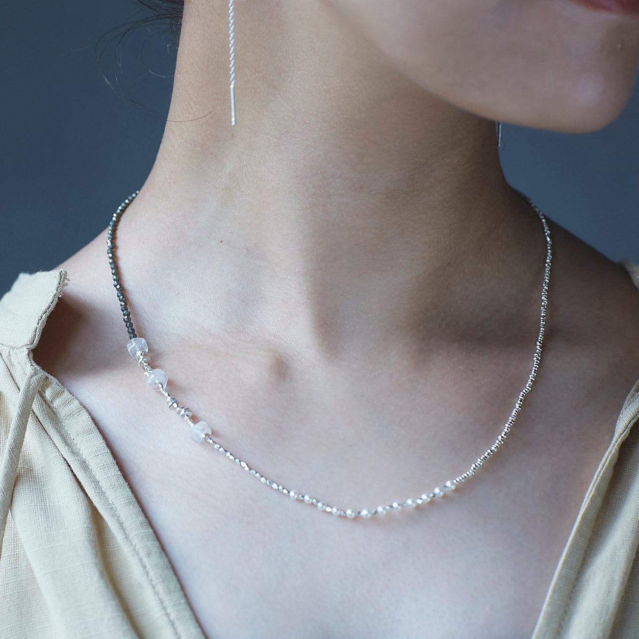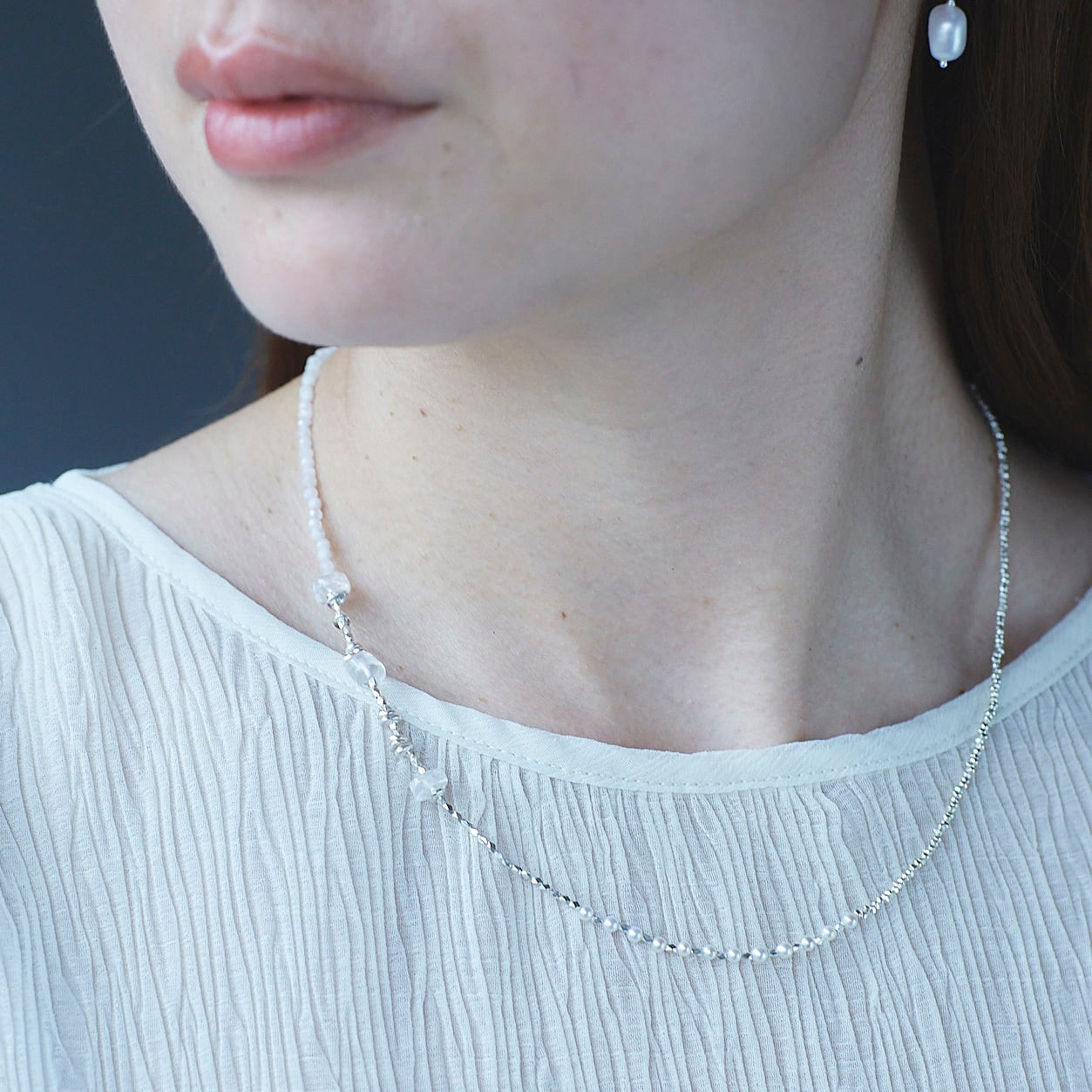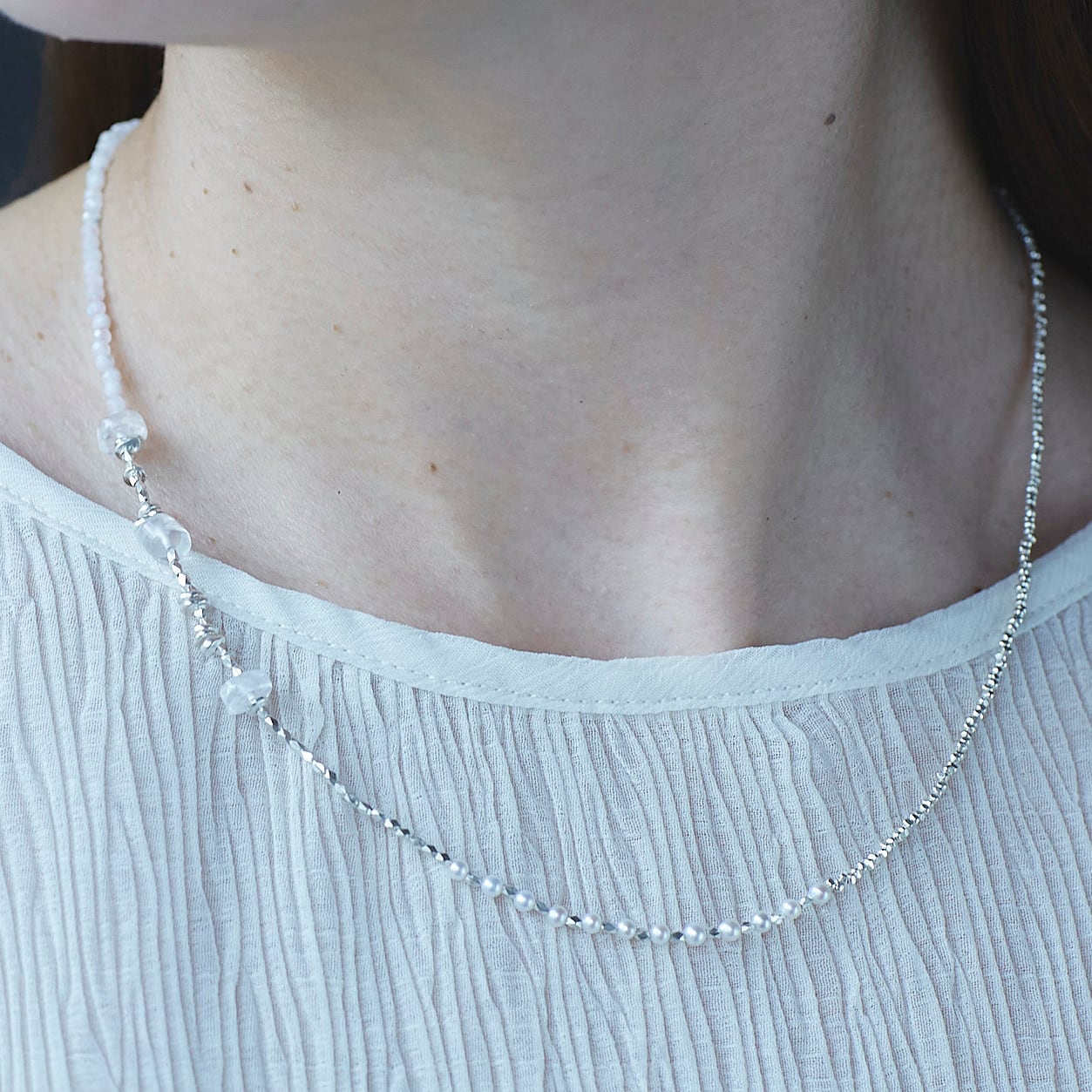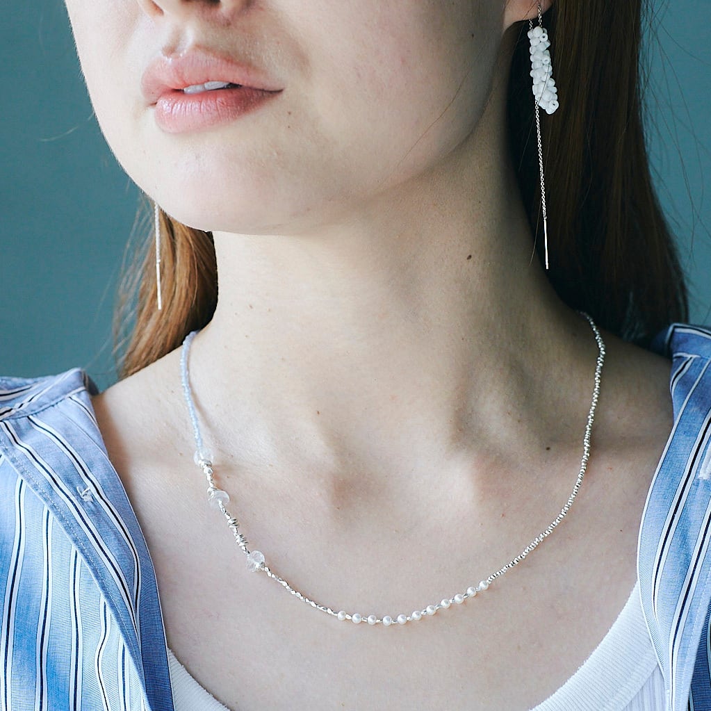 天然石ビーズと淡水パール、シルバービーズを贅沢に使用した、さまざまな表情が楽しめるネックレス。