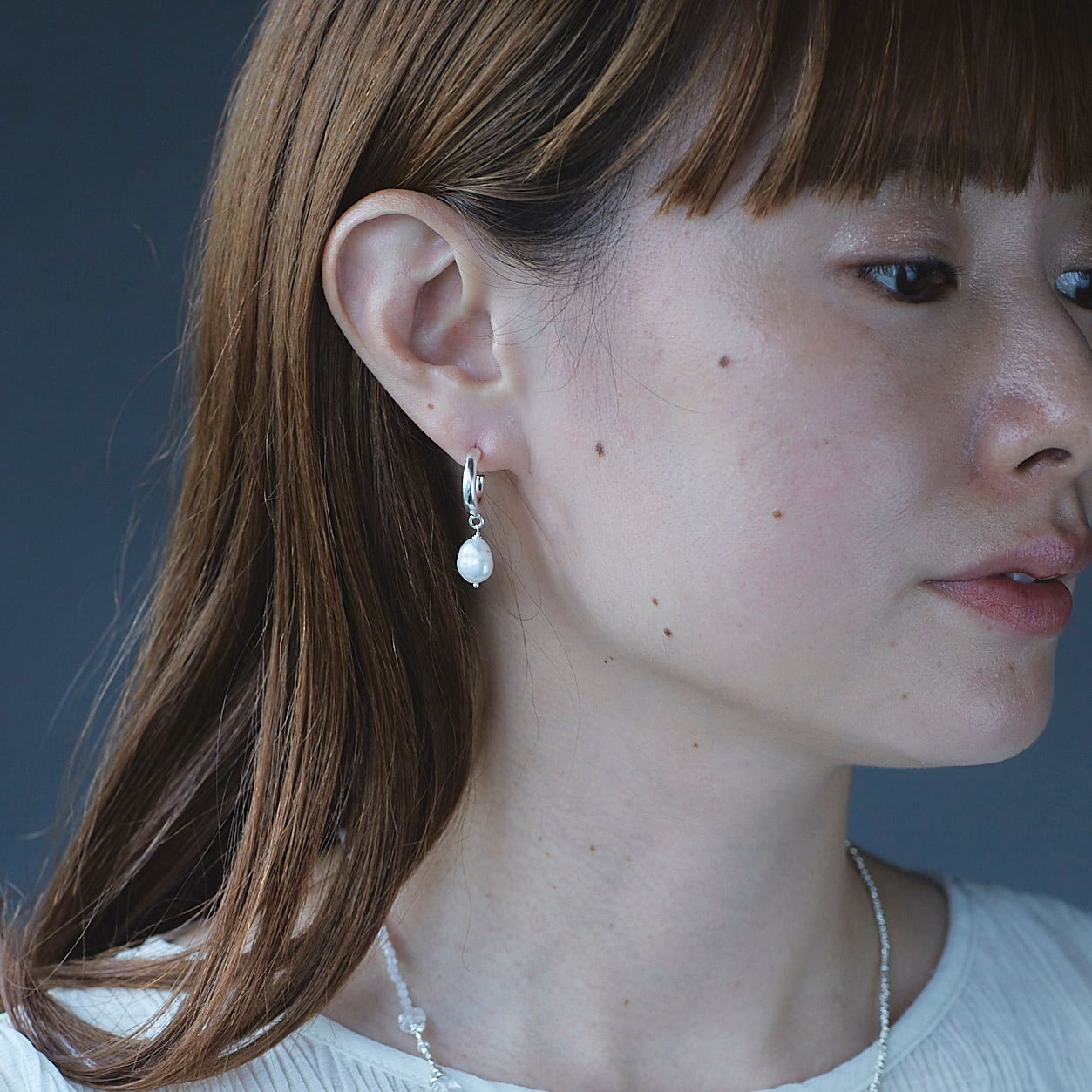 耳元で中粒のパールがちりちりと揺れるピアス・イヤリング。