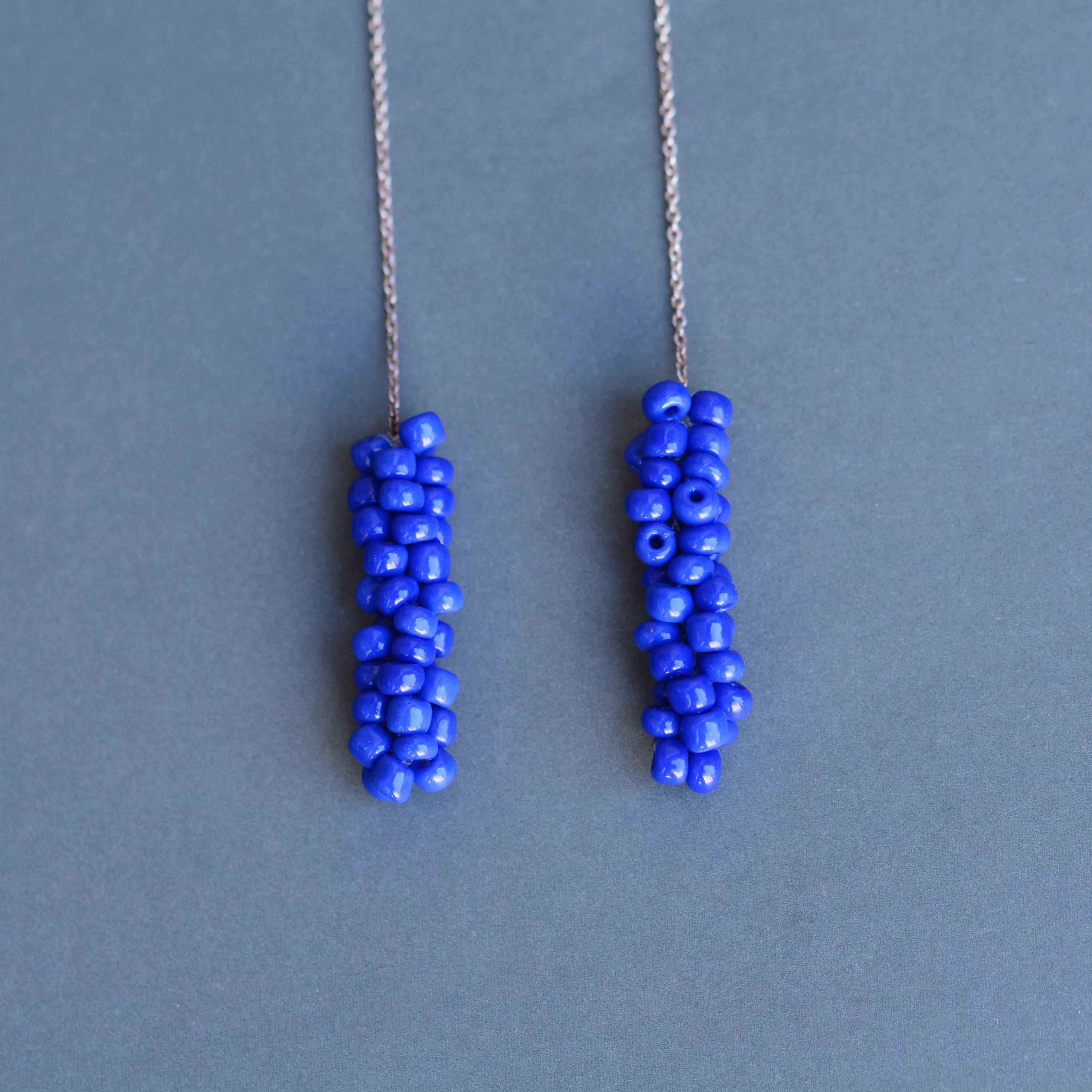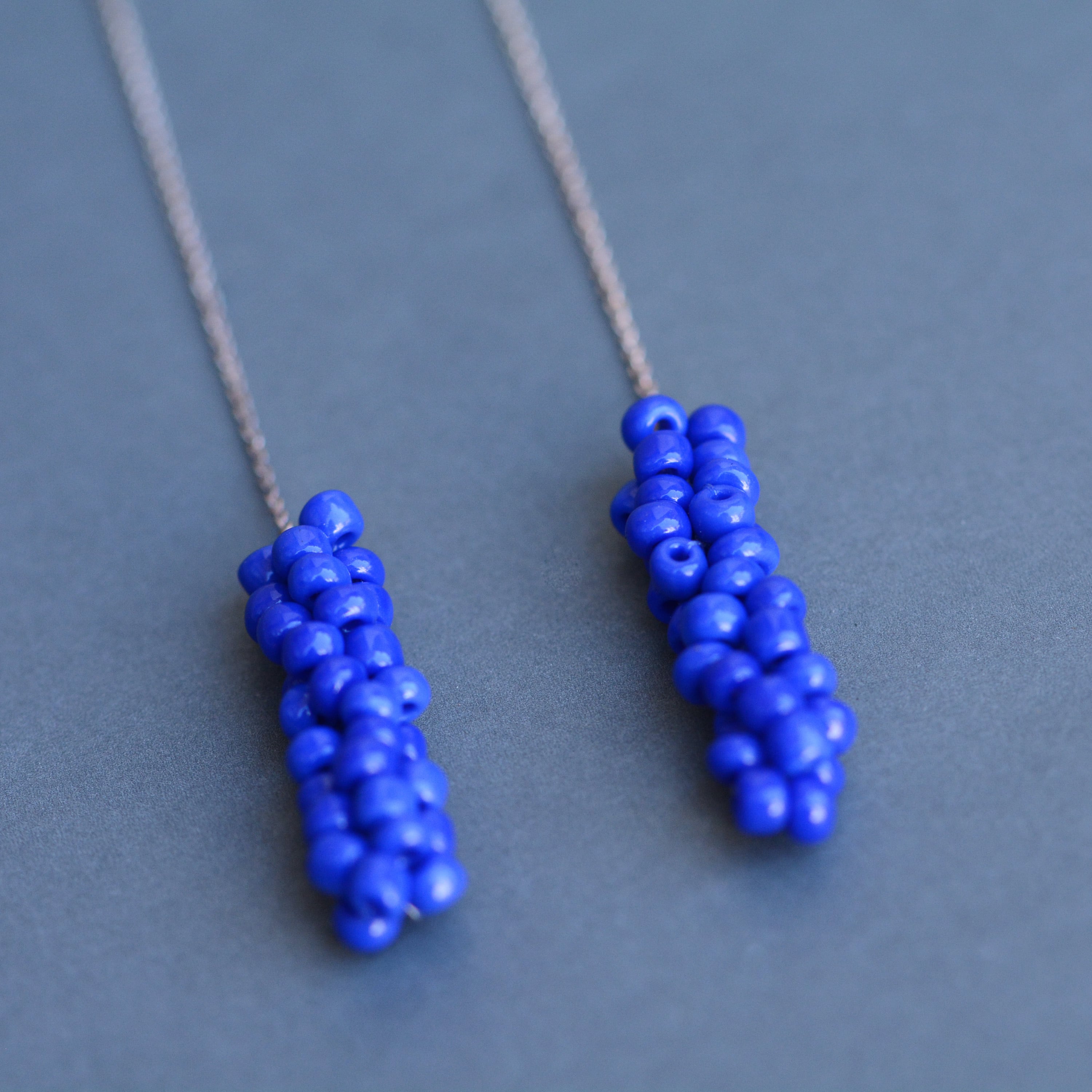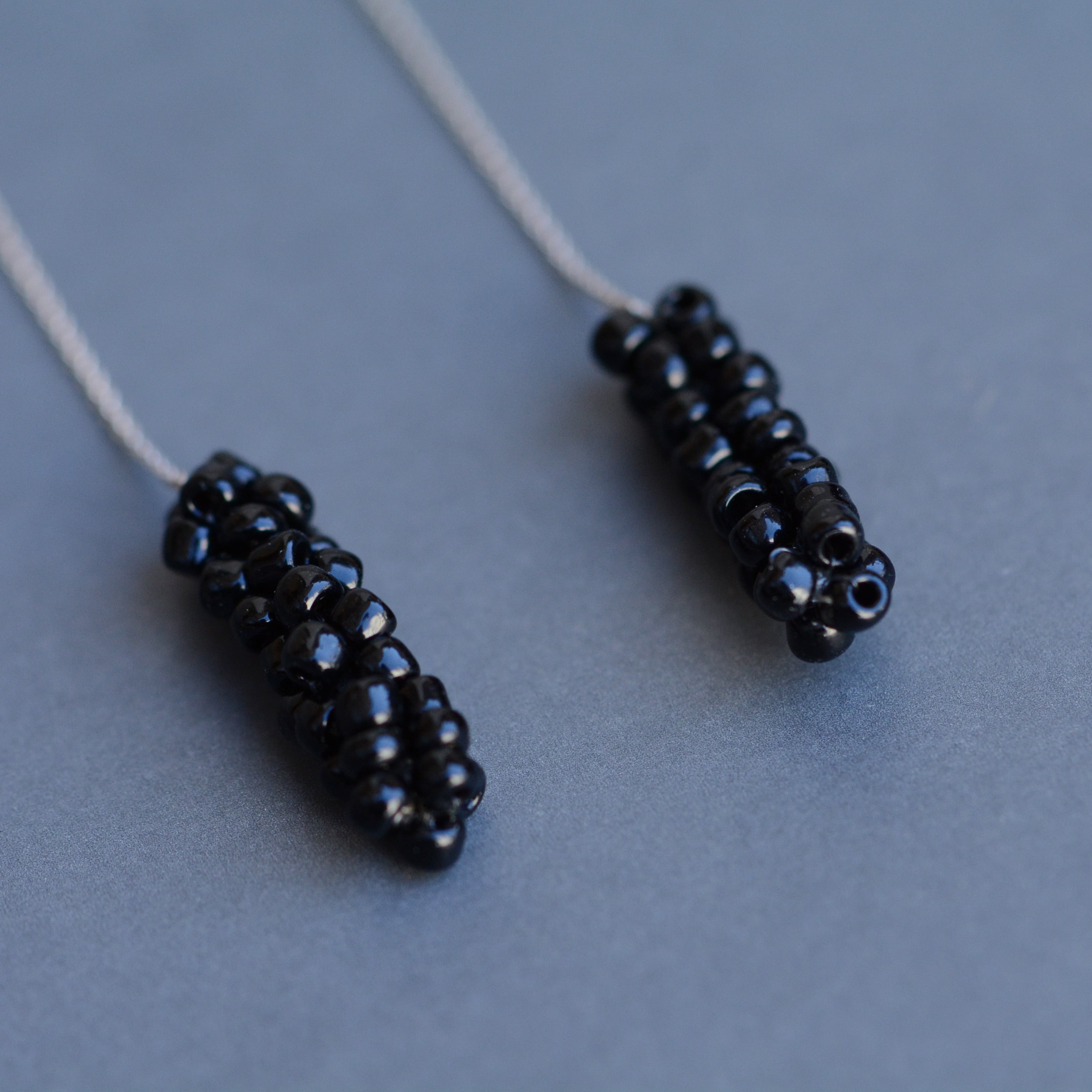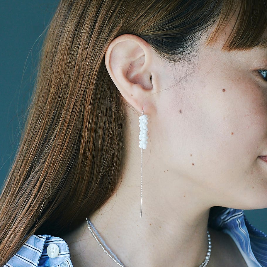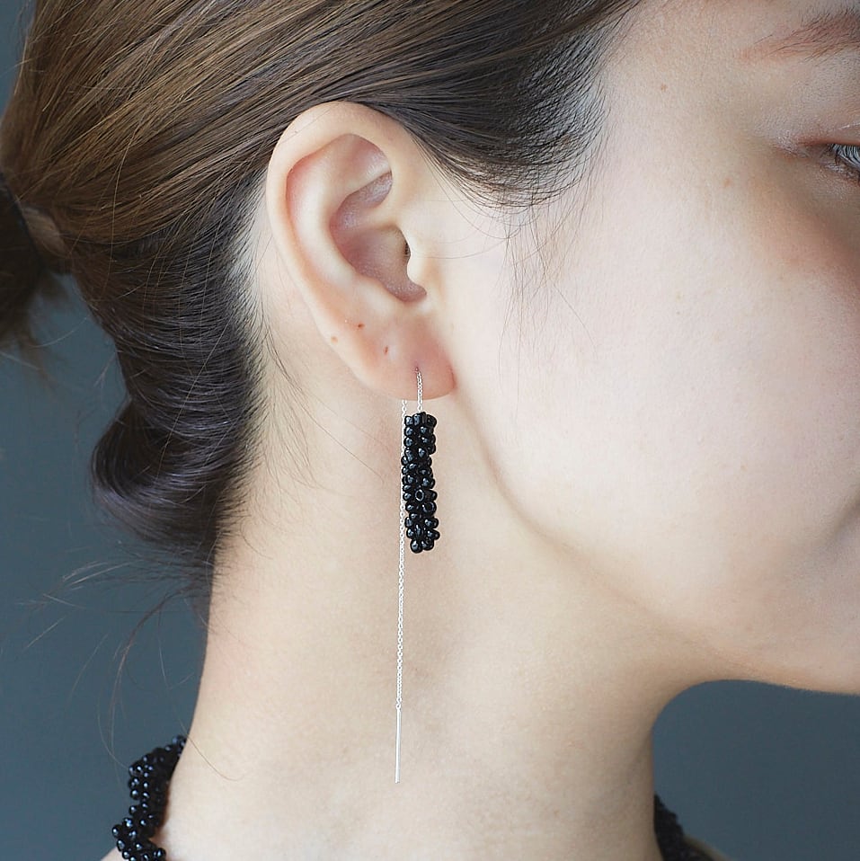 ガラスビーズをフランス製のsilkレース糸で編んで作ったピアス。