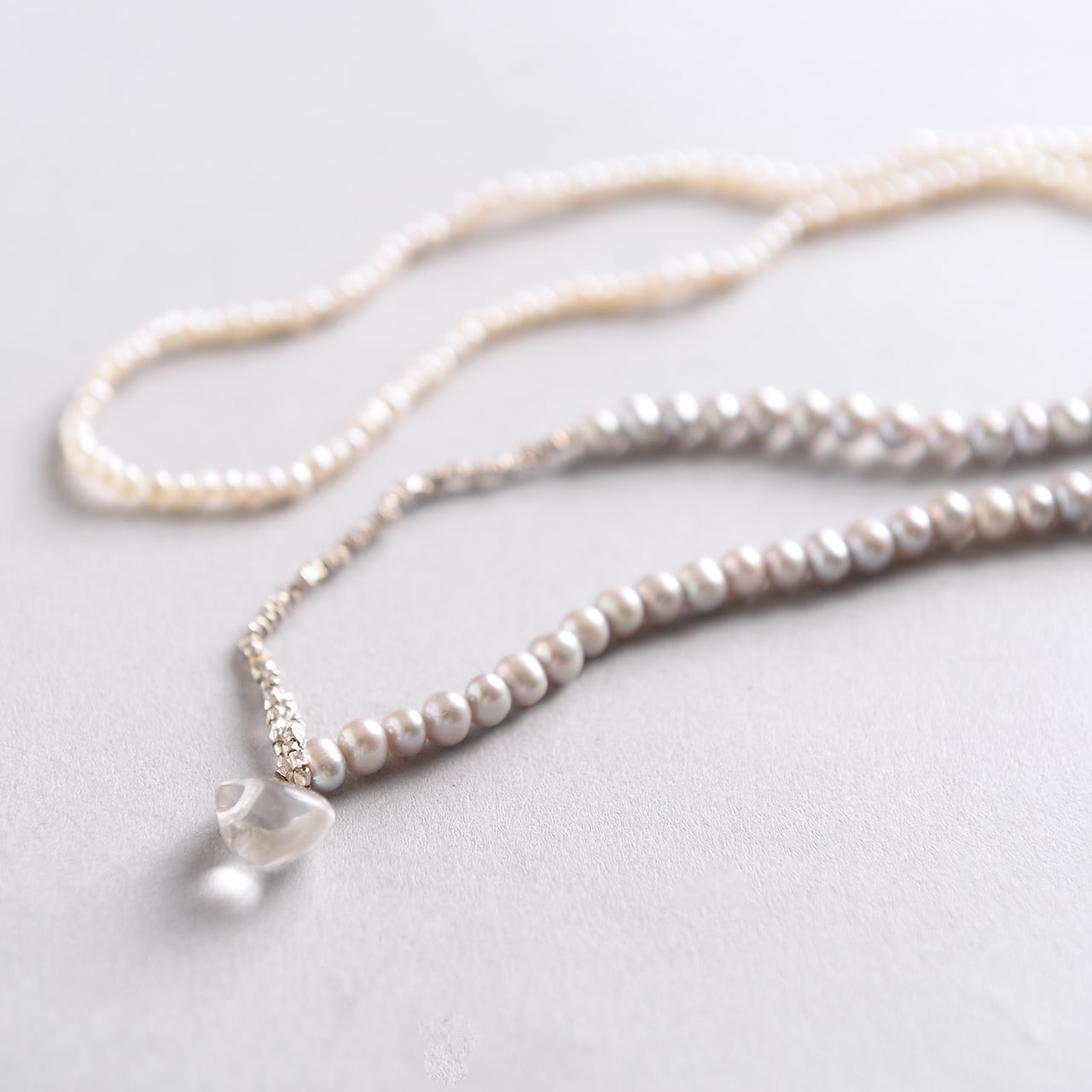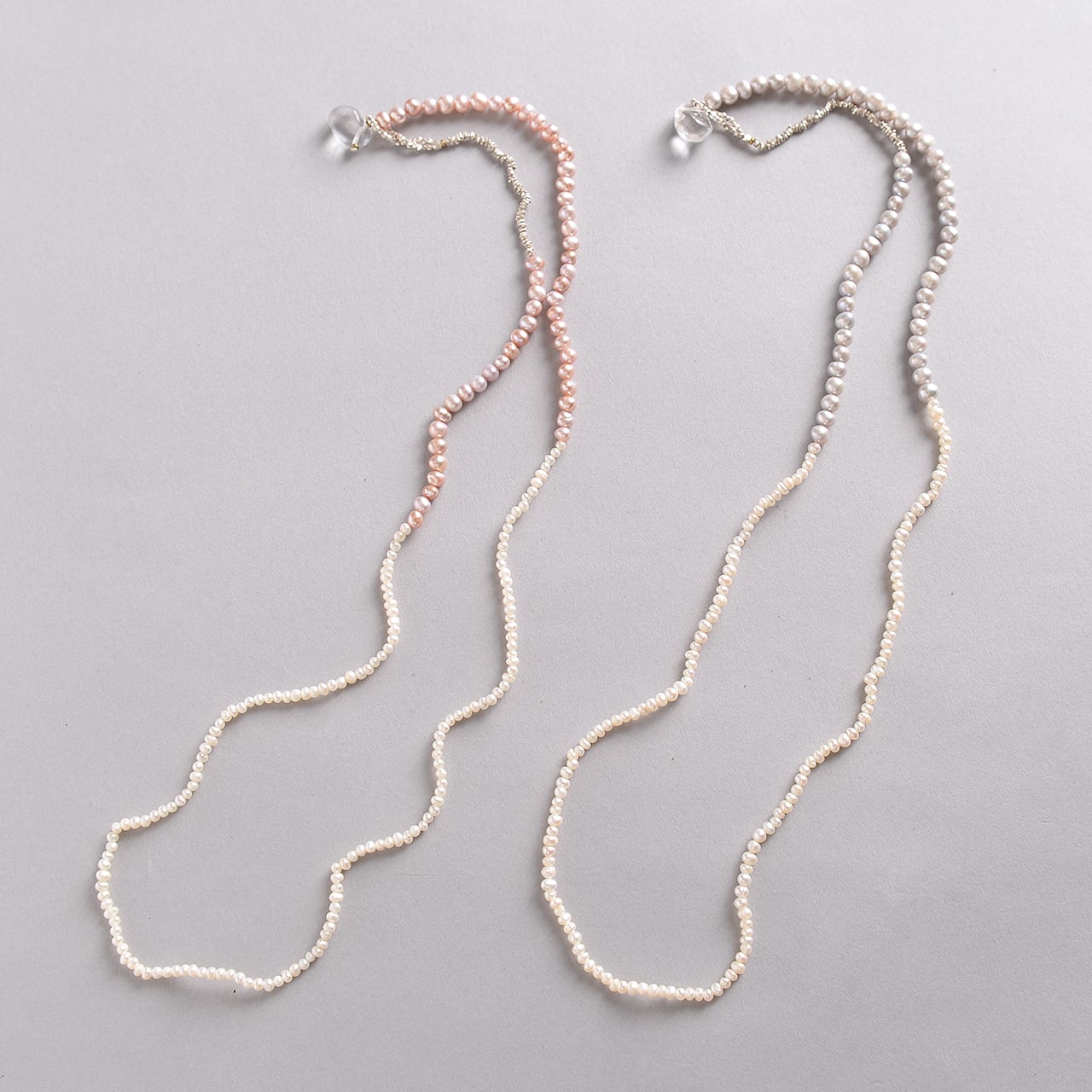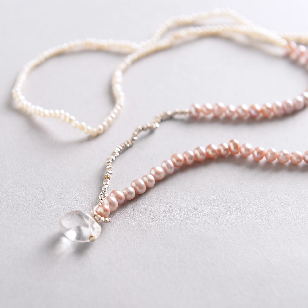 3mmのwhiteの淡水パールと4mmのpink,greyの淡水パールを合わせたネックレス。 カジュアルな装いもオケージョンにも使える、パールシリーズ。 トップにはクリスタルを使用し、どこをセンターにしてもok。 size:55cm material: freshwater pearl/ silver925/ crystal