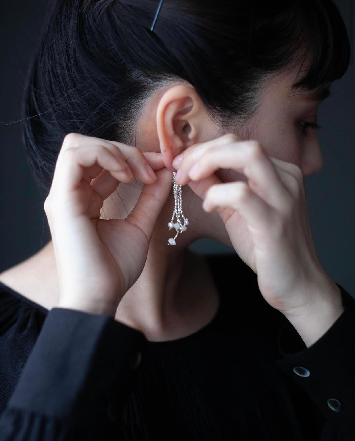小粒パールとシルバービーズを使ったピアス・イヤリング。 オリジナルにカットしたビーズが角度によって繊細に輝きます。 定番のビーズを使っているので他のアイテムとも相性がいいです。 size :7.5cm material:freshwater pearl,silver