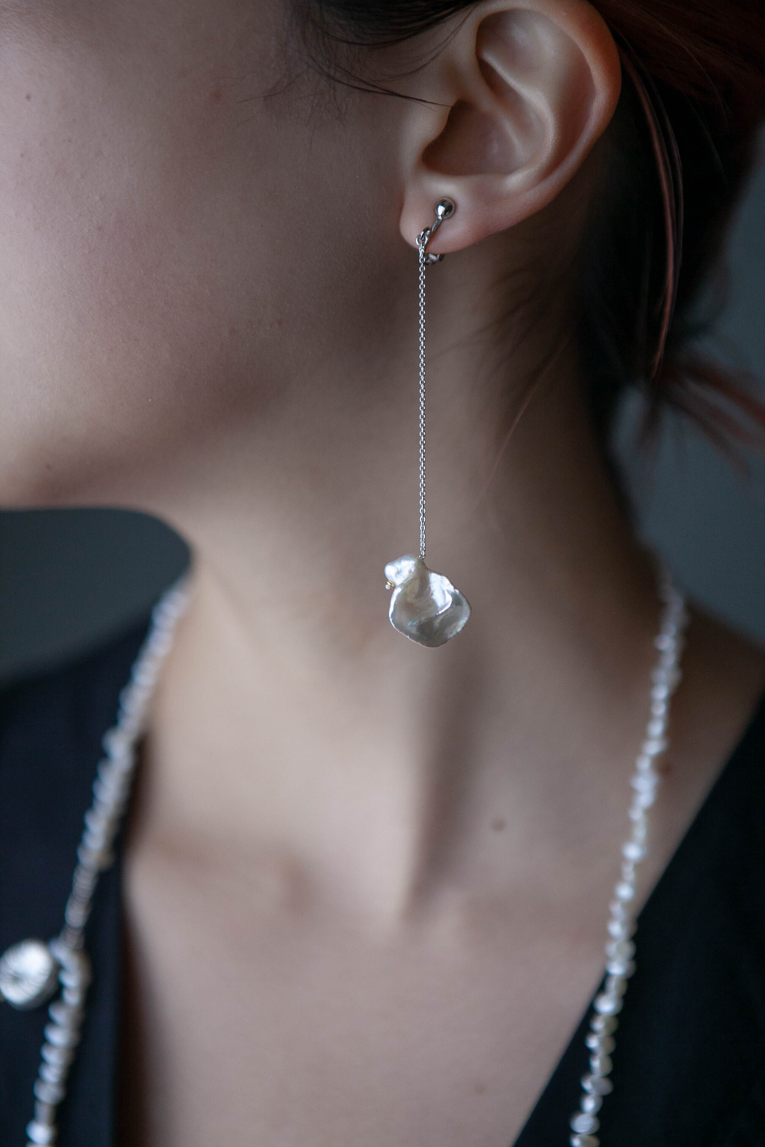 シンプルなチェーンピアス。 トップには淡水パールを。 ふとした仕草でパールが揺るシルエットが素敵です。 size: パール 約1.5cm チェーン:10.0cm material:freshwater pearl, silver