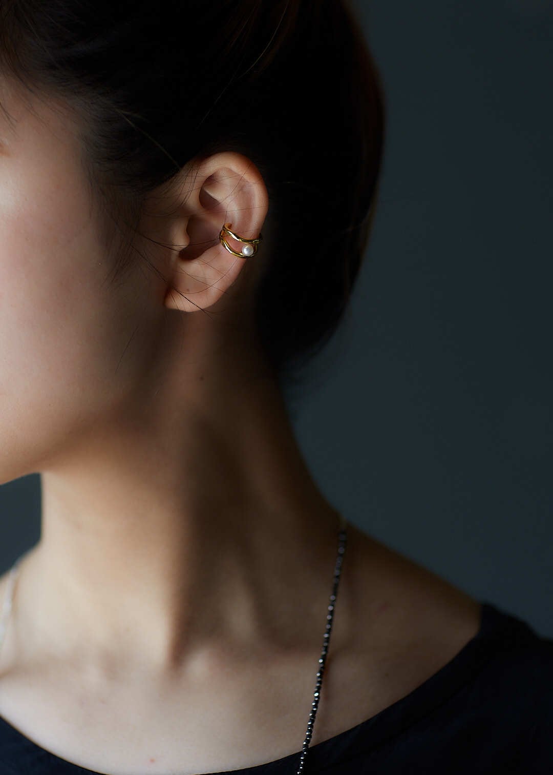波打ったようなニュアンスのラインのイヤーカフ。 真ん中にはパールをあしらいシンプルながら存在感あるアイテムです。 size: 約1.3cm material:freshwater pearl, silver,22金メッキ