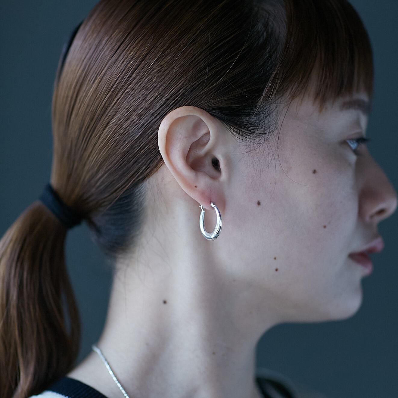 シンプルなフープピアス。 太すぎないけど存在感があるデザインです。 服装を選ばないので使いやすく1つ持っていると重宝するアイテムです。 size:22mm material:silver925