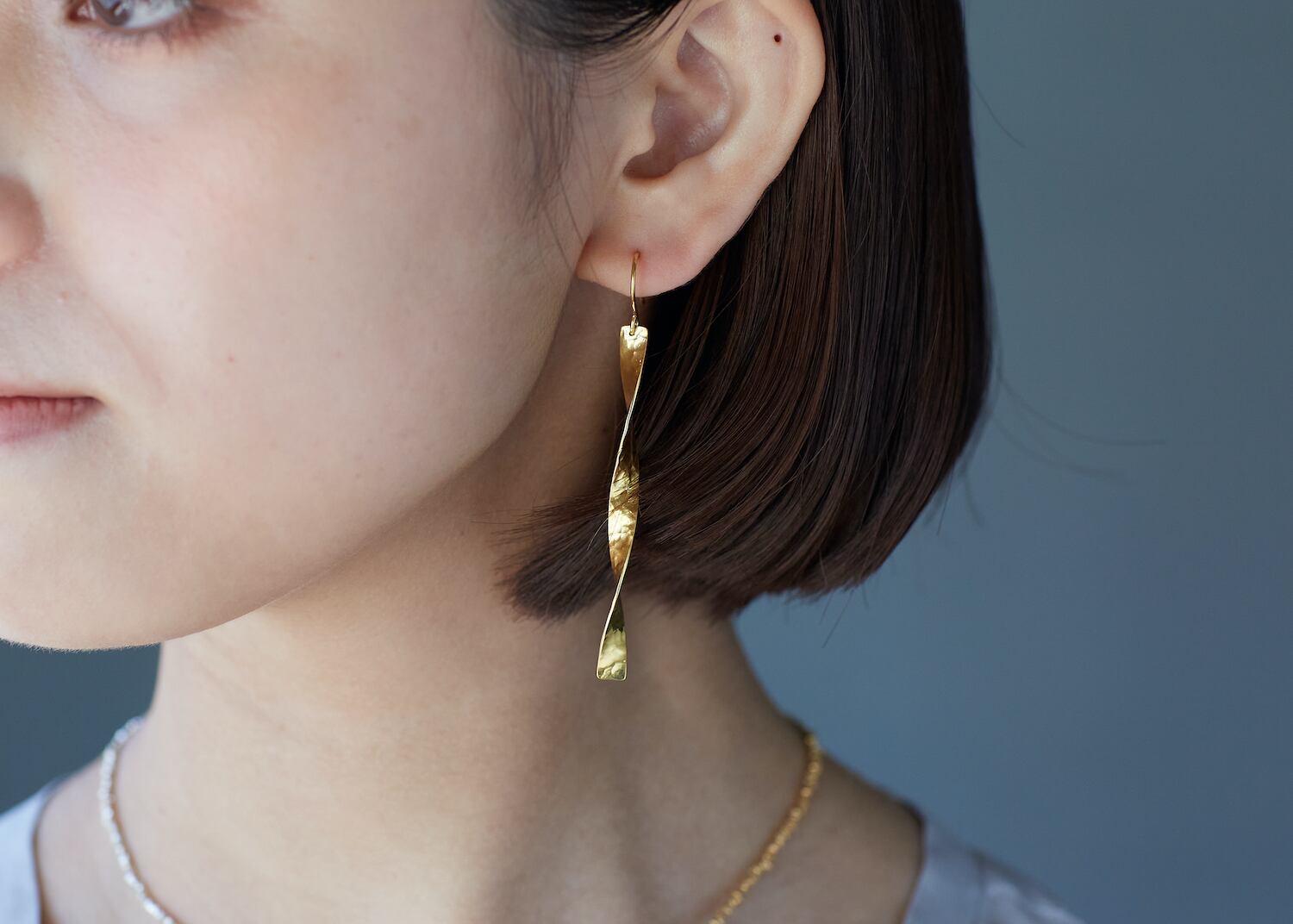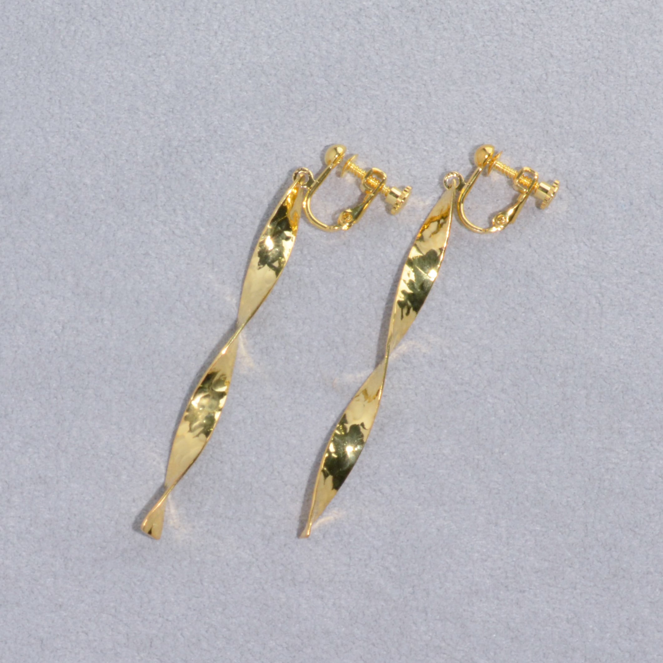 ねじりのあるデザインで光に当たるとキラリと反射します。 シンプルな中にも存在感があり、耳元を素敵に飾ります。 モチーフ部分size:約5cm material:silver925,22金メッキ