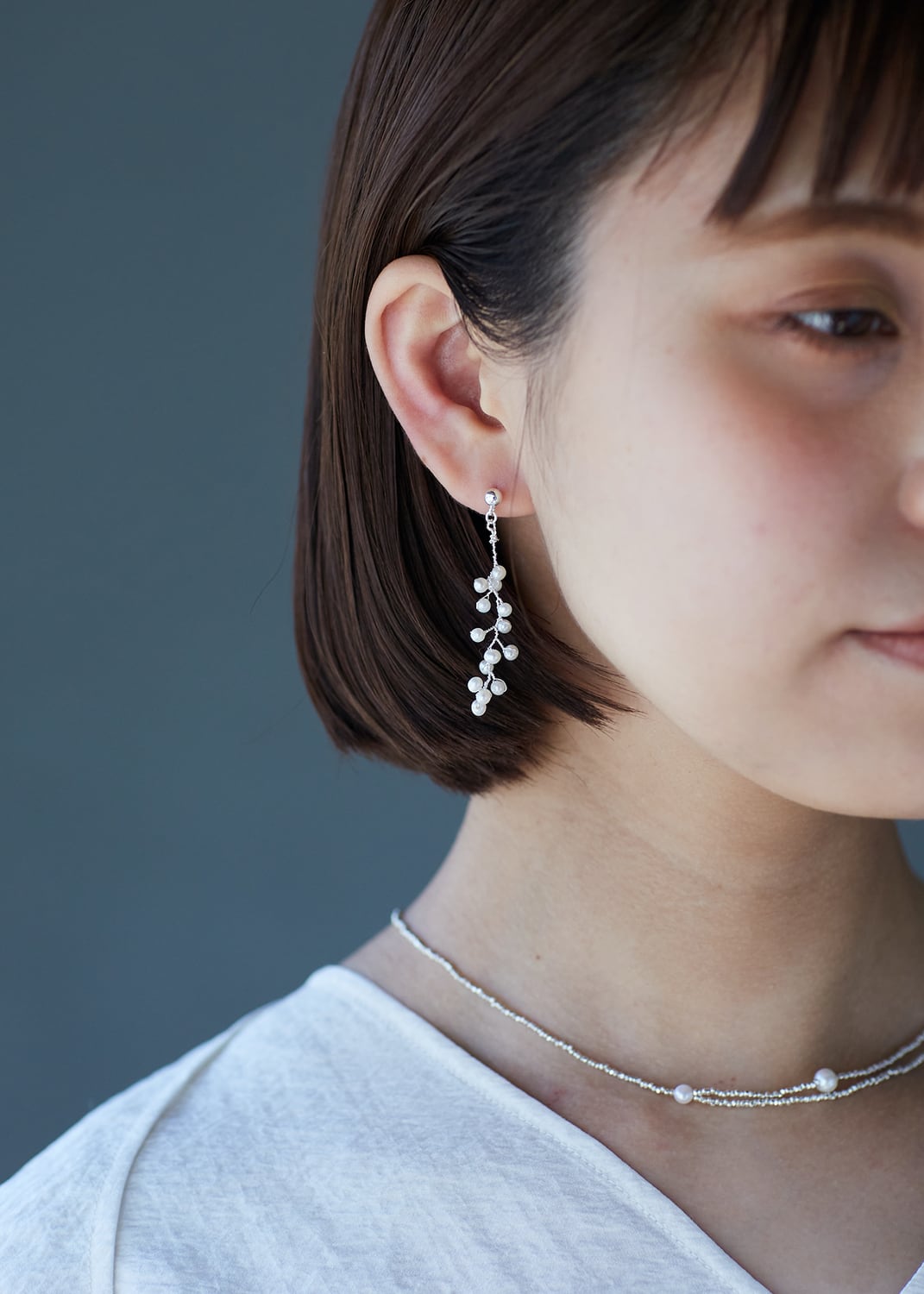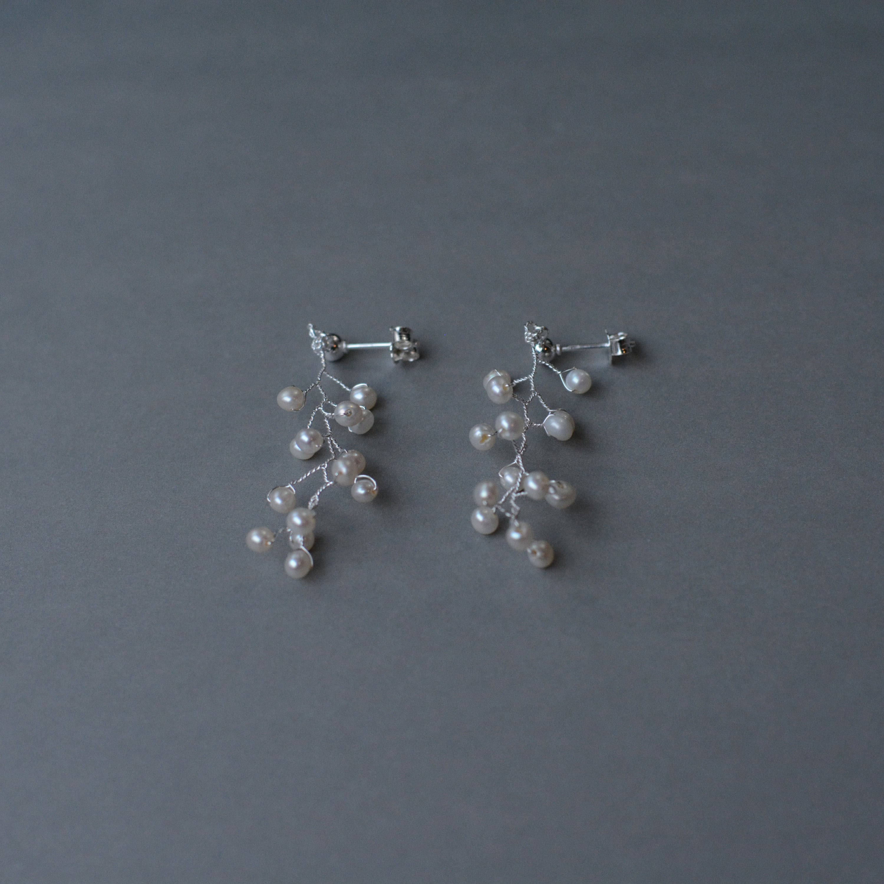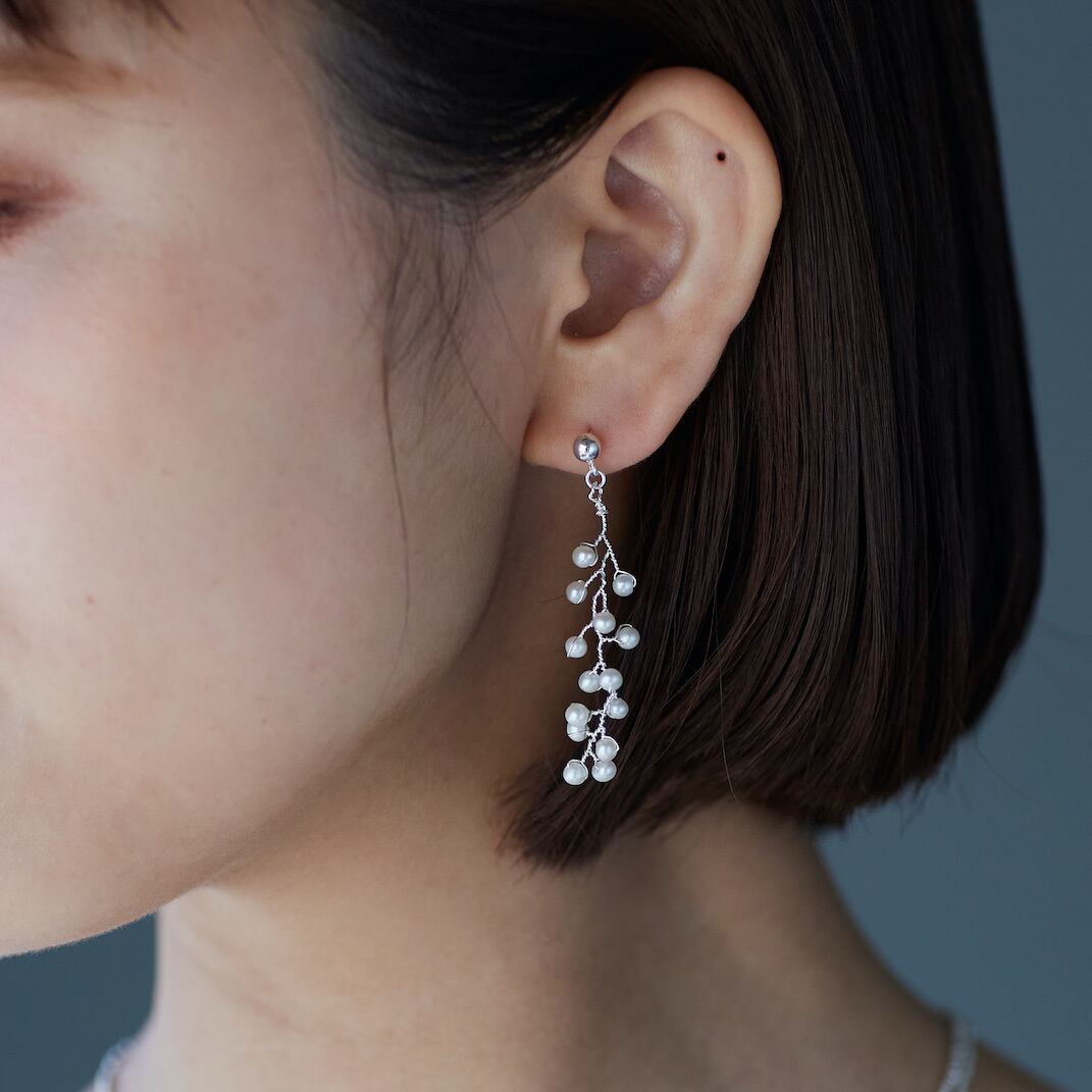 小粒の淡水パールを枝のように丁寧にワイヤーで編み上げた、繊細で女性らしいピアス。 光を受けて優しく輝くパールが、まるで花や木の実のように耳元で揺れ、 上品な華やかさを添えます。 フォーマルシーンはもちろん、日常のコーディネートにも自然になじみます。 material:silver925/Freshwater pearl