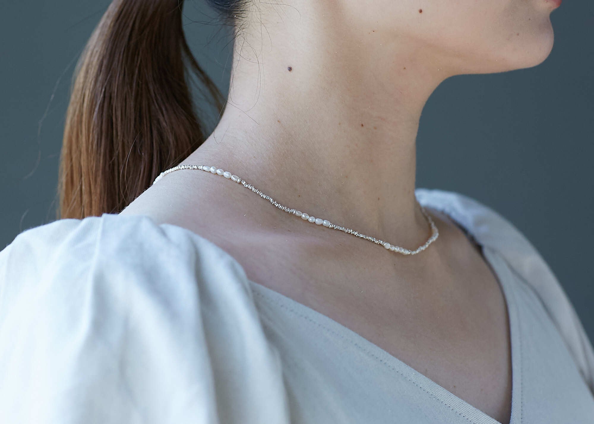 お米のような形状の小粒パールとシルバービーズを合わせたネックレス。