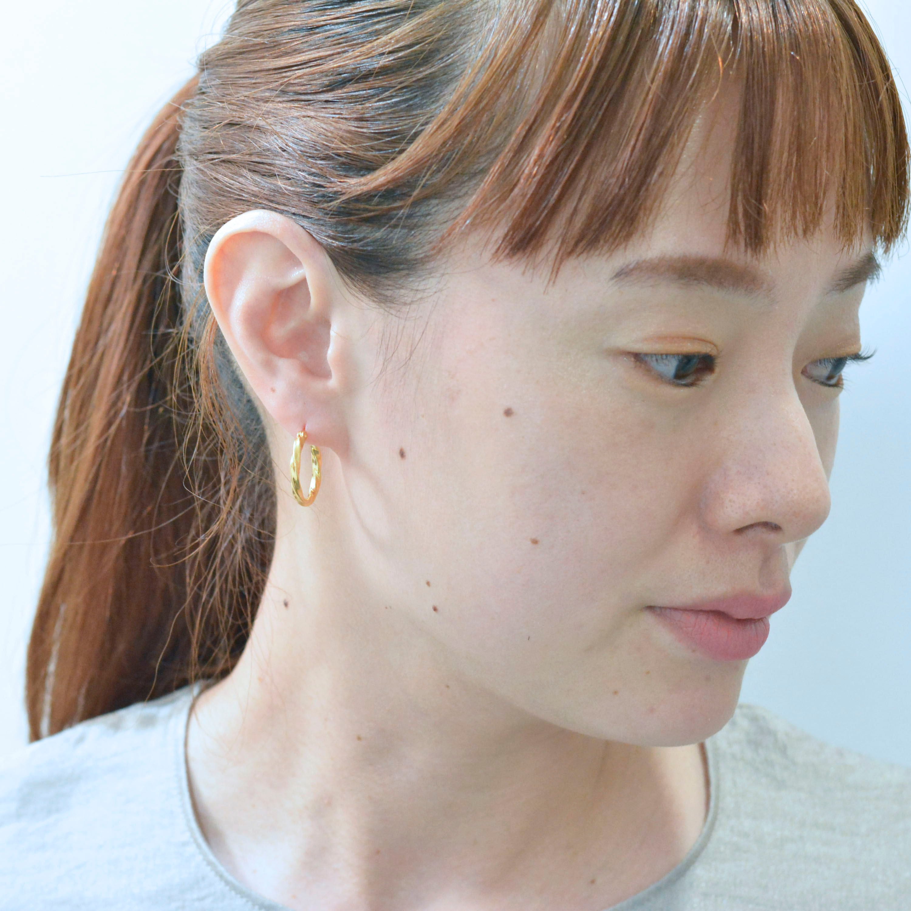 シンプルで存在感のあるピアス。 モチーフにはねじれが施され、シンプルでありながらも個性を演出でき、 ポイントになるようなデザインです。 size:20mm material:silver925,22金メッキ