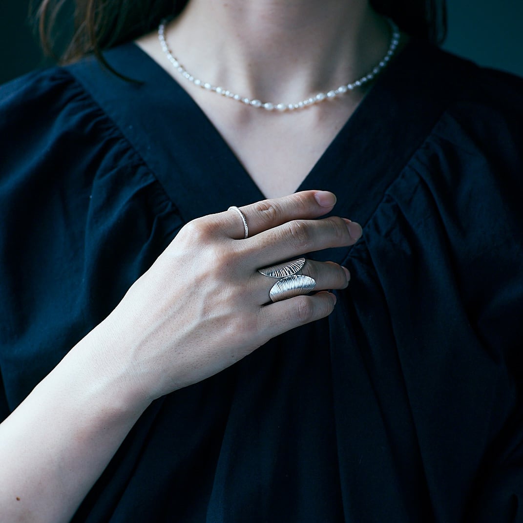 うろこのようなユニークなデザインが特徴的なリングです。 重ね付けや他のアクセサリーとのコーディネートも楽しめ、様々なシーンで活躍します。 調整が可能なリングです。 size:free(最小時サイズ:およそ12号)